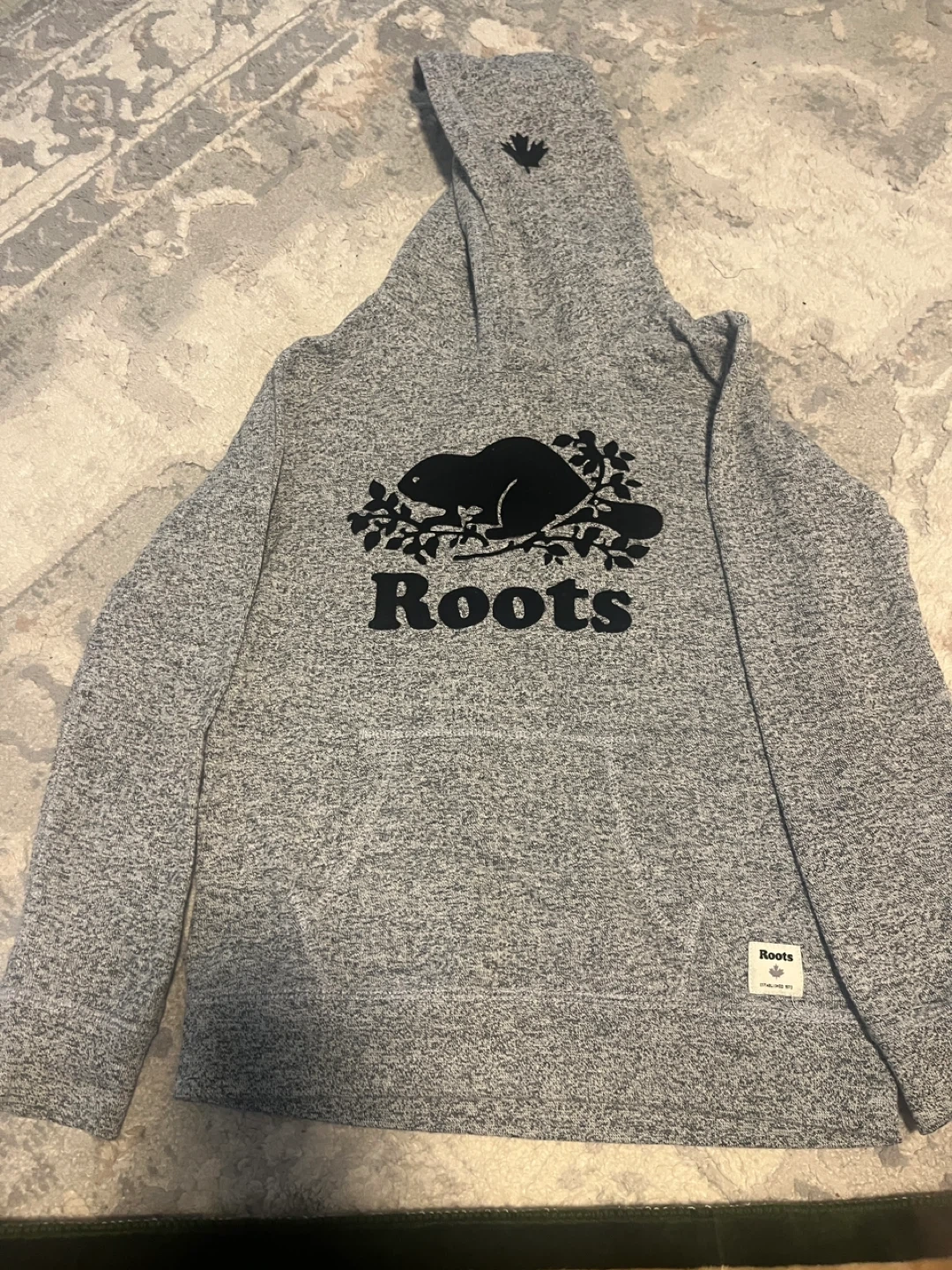 Roots Kids hoodie in size XL, suitable for kids aged 11-12 years. It features the classic Roots beaver logo on the front. Perfect for keeping your little one warm and cozy!