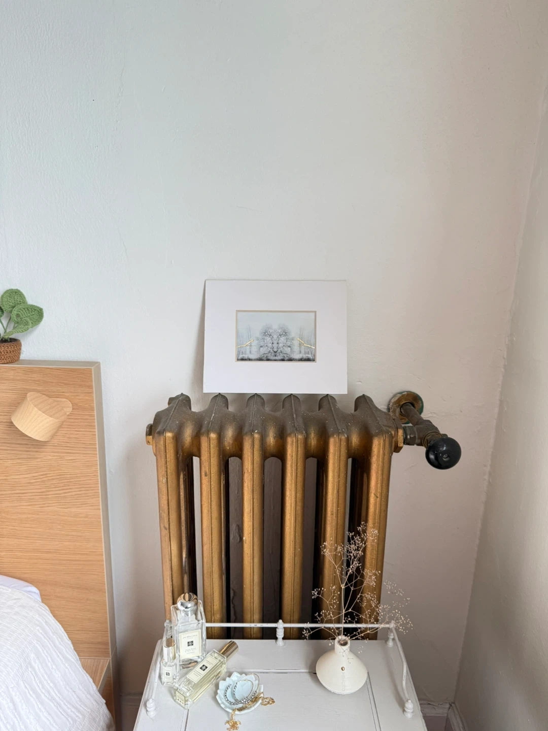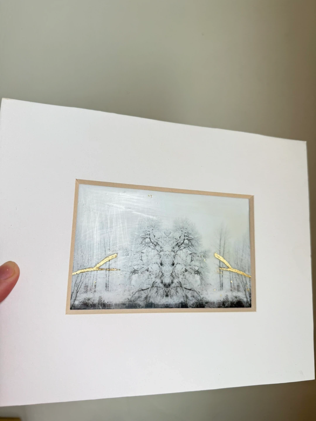 Beautiful black-and-white original photograph mirrored image of frosted and snowy trees in winter, treated with encapsulation wax and 24 karat gold leaf detailing.