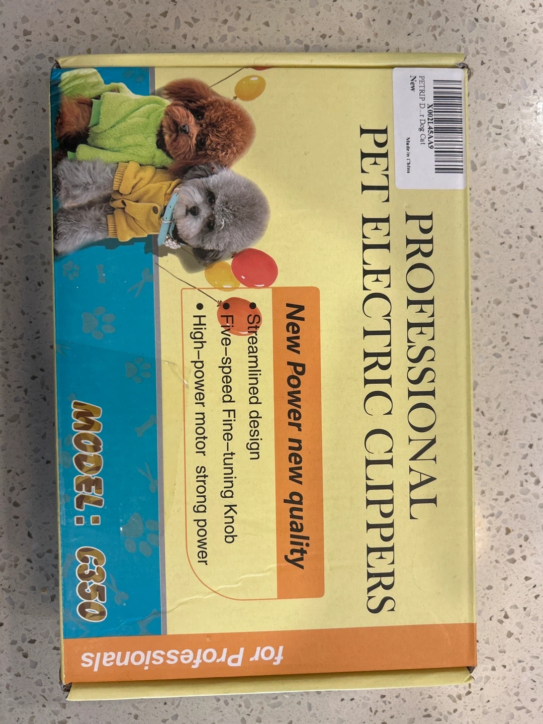 I'm selling a brand new professional pet electric clipper, model C350. It features a streamlined design and a five-speed fine-tuning knob. Plus, it has a high-power motor for strong power. It also comes with a standard 4 limit comb, a titanium ceramic blade, and a 0.8-2.0mm acute-adjusting knob. The box is included!