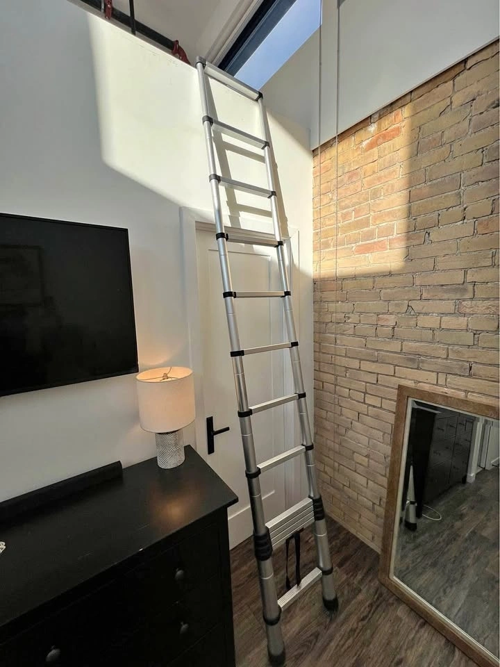 Extendable ladder. Extends by each level until desired height and locks in. Easy to expand and take down.