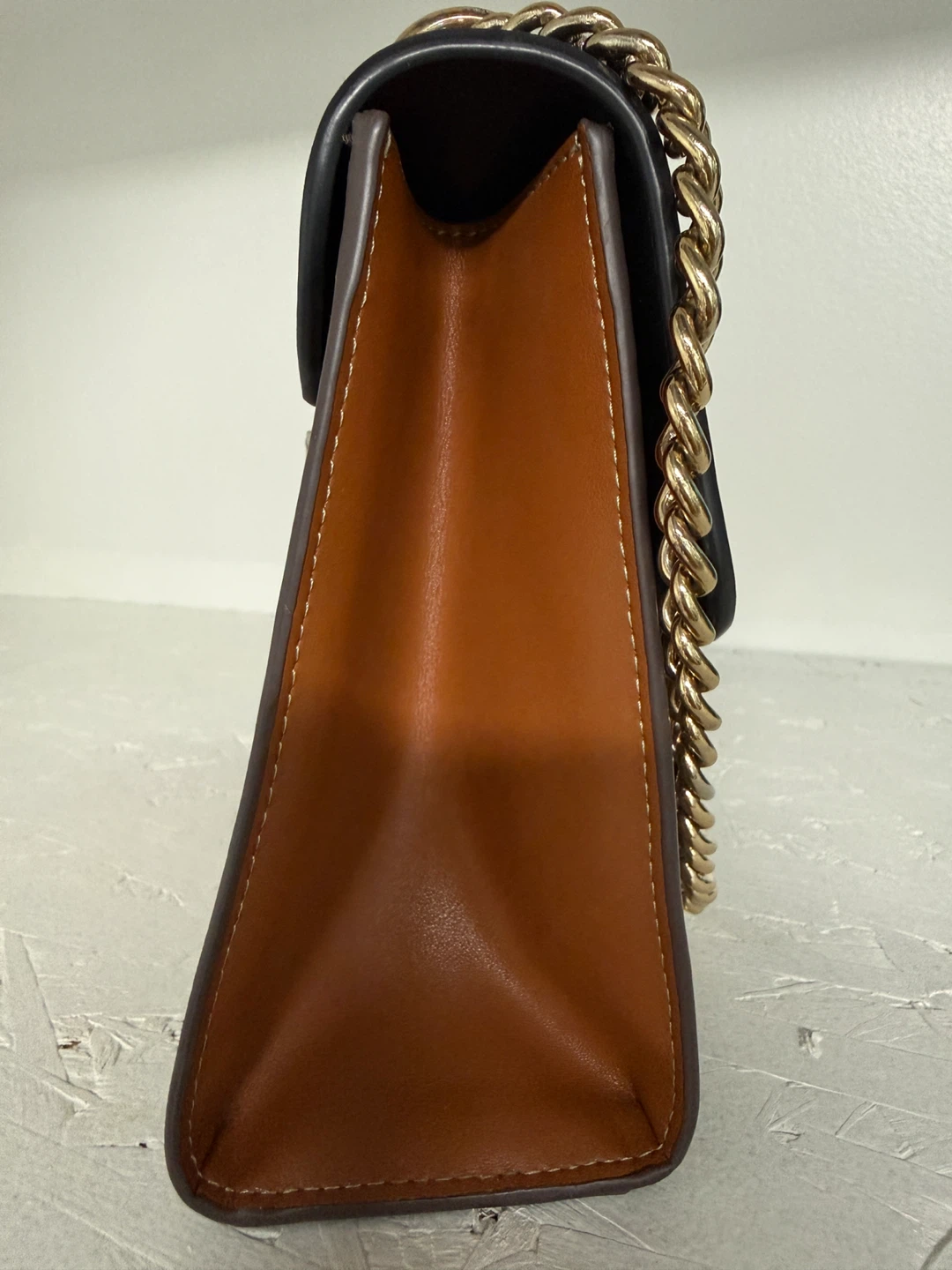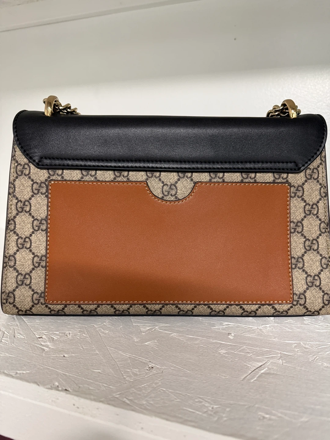 Selling a Gucci Padlock GG Supreme shoulder bag! It features the classic GG supreme pattern with a black and brown leather flap and accents, along with a gold-tone chain strap. The bag has a padlock closure and is in excellent condition!