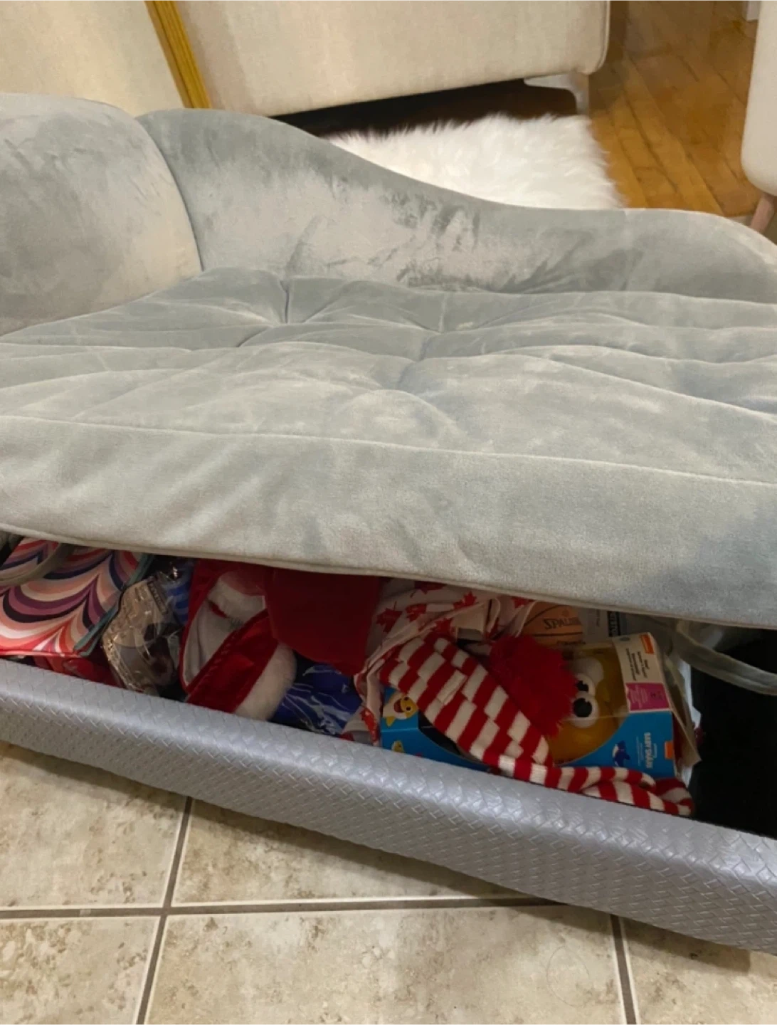 Selling a lovely grey chaise lounge for pet , It's in great condition and would be a stylish addition to any room. Plus, it has a handy storage compartment underneath for blankets, pillows, or anything else you want to keep tucked away. It's super comfy for lounging and relaxing