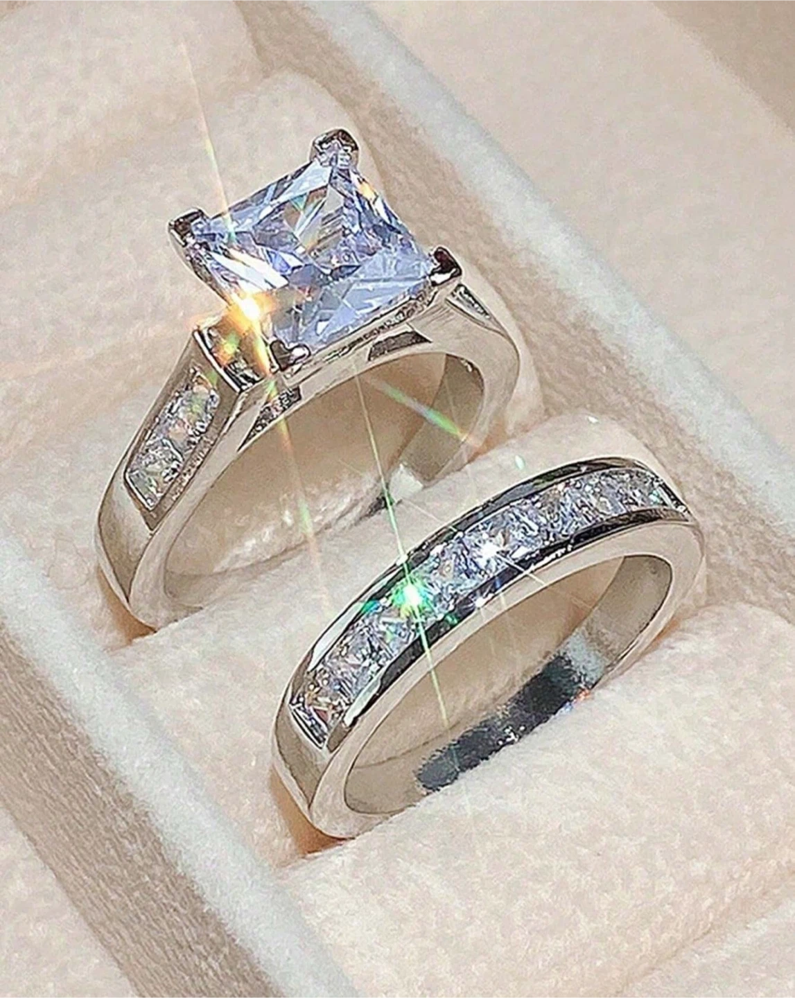 This is a beautiful wedding ring set featuring princess cut cubic zirconia stones. It includes both the engagement ring and beautiful band