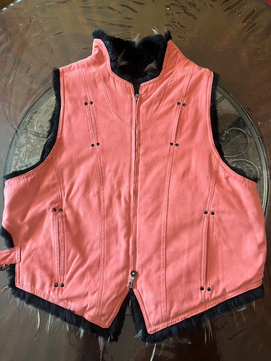 The Vintage Jamie Sadock Black and Gray Rabbit Fur Vest is a stylish and versatile addition to any woman's wardrobe. Featuring a reversible design in peach suede, this short-length vest is perfect for casual occasions during the winter, fall, and spring seasons. The zip closure and size L make it easy to wear and comfortable for everyday wear. Made with high-quality materials and expert craftsmanship, this Jamie Sadock vest is a timeless piece that can elevate any outfit with its unique design and sophistication. Small tear in the back of the vest that can be easily fixed