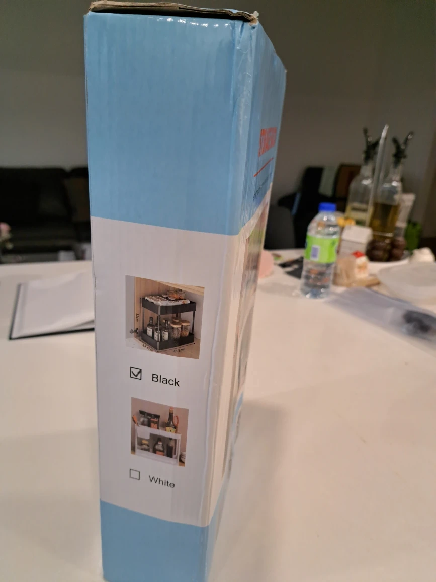 I'm selling a black storage rack. It's perfect for organizing your spices or other items in your kitchen or bathroom. The rack is still in the box. Never opened!