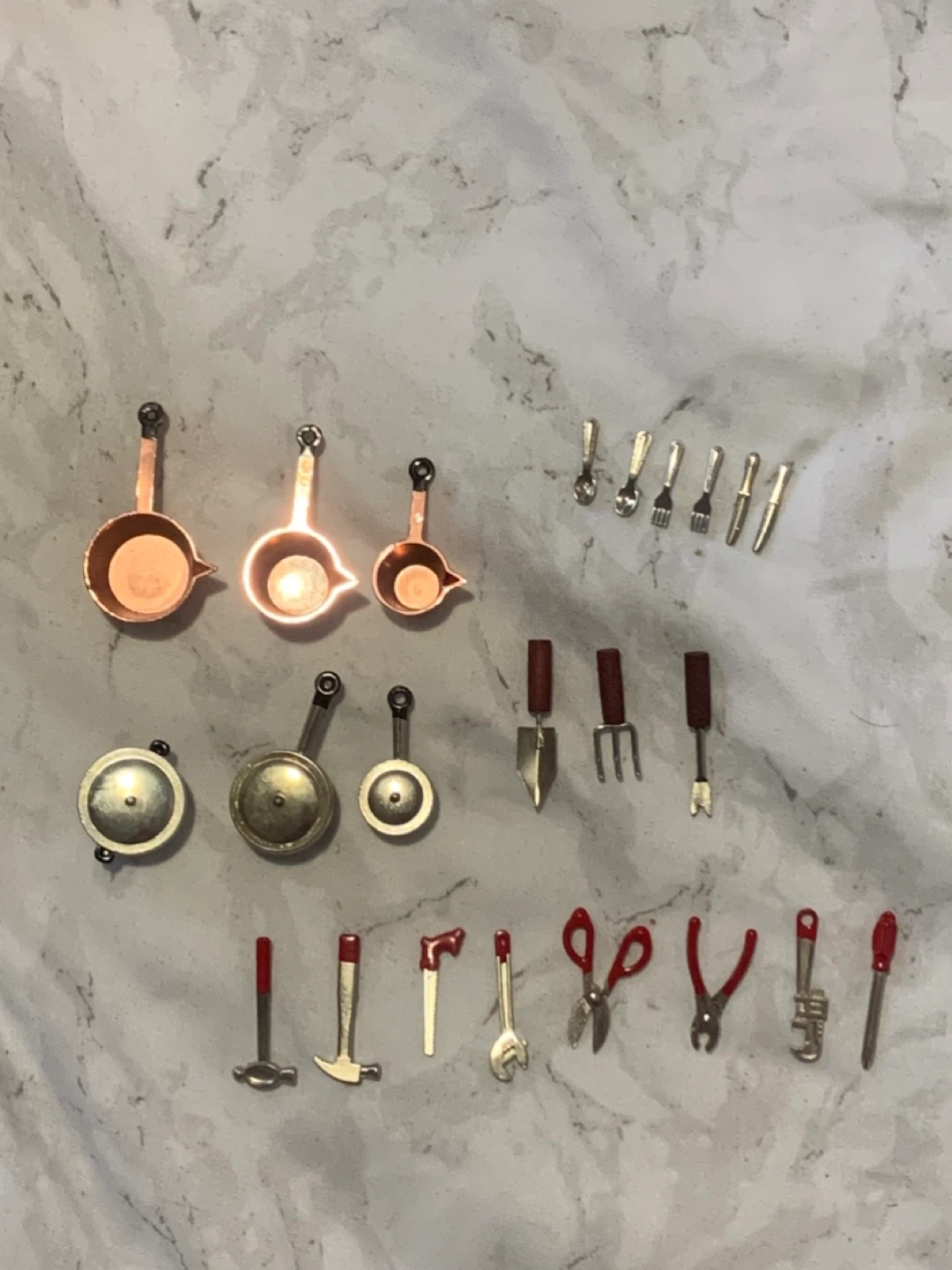 A collection of miniature kitchen & garden tools! These little pieces are perfect for a dollhouse or miniature scene. They include copper pots, pans, garden tools & more!
