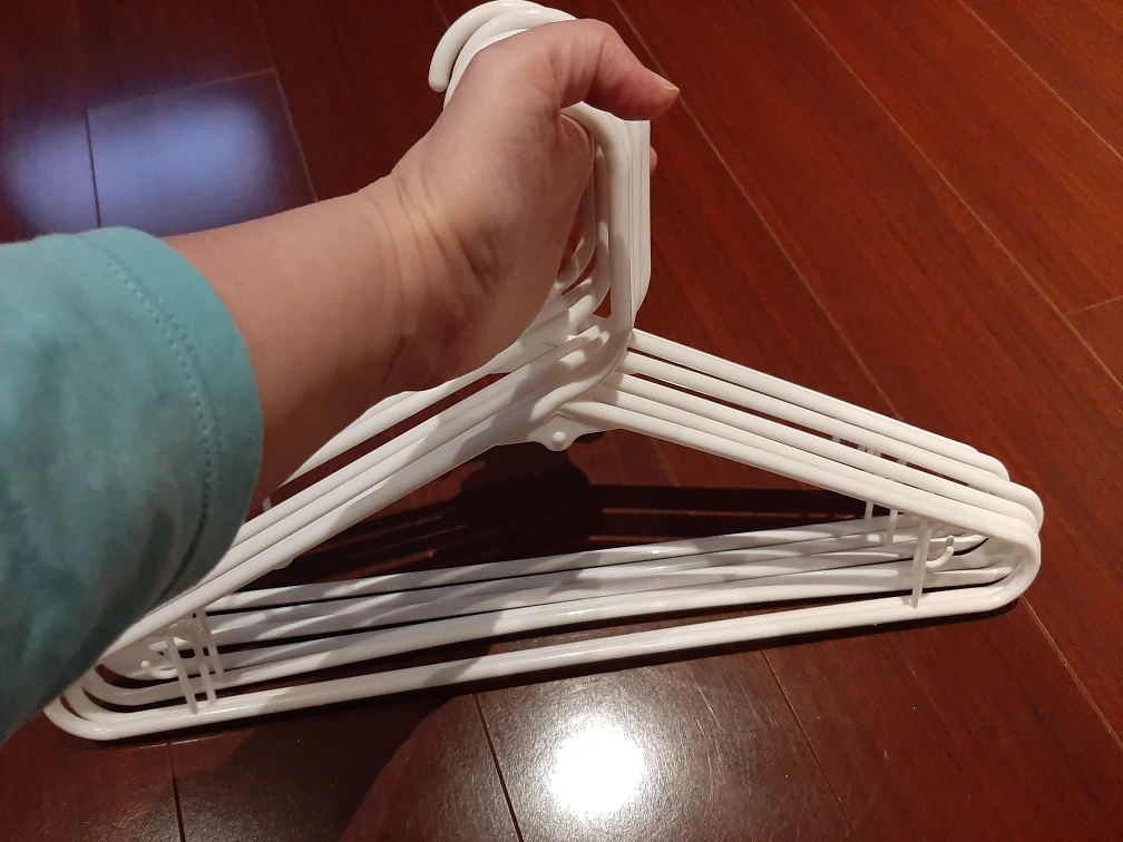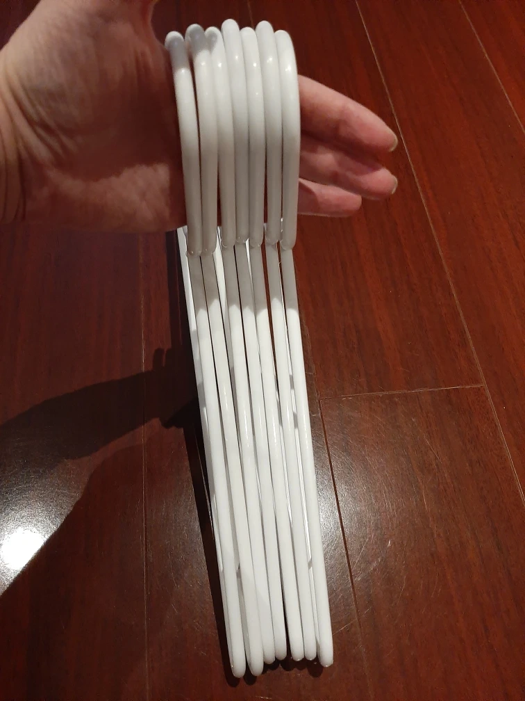 Like New. Selling a set of 7 white plastic clothes hangers. They're in perfect shape and ready to help organize your closet!