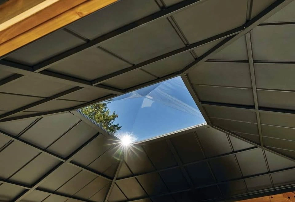 This CANVAS Waterton Hot Tub Gazebo features a steel frame and a natural wood finish for durable outdoor use