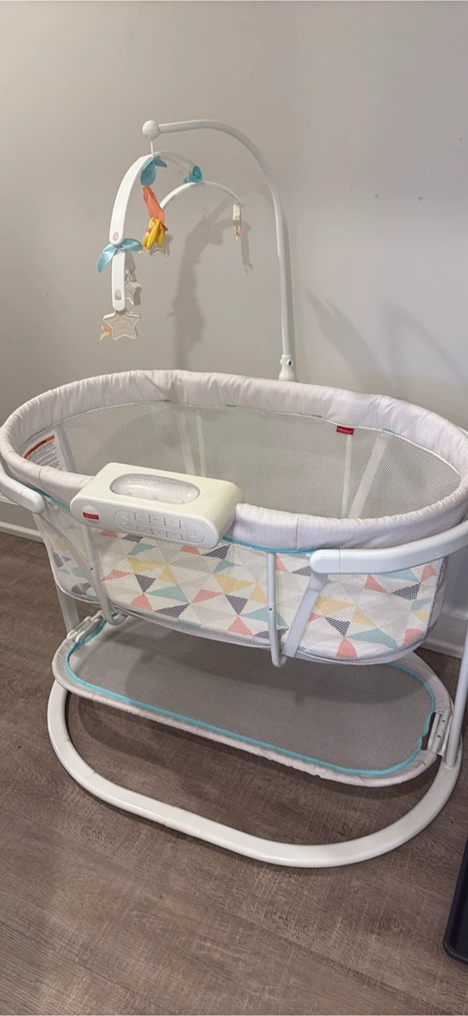 Selling a Fisher-Price Soothing Motions Bassinet in great condition! The bassinet features gentle swaying motions, calming vibrations, and soothing sounds to help your baby drift off to sleep. It also includes a mobile with cute toys to entertain your little one. Recommended age range is newborn and up