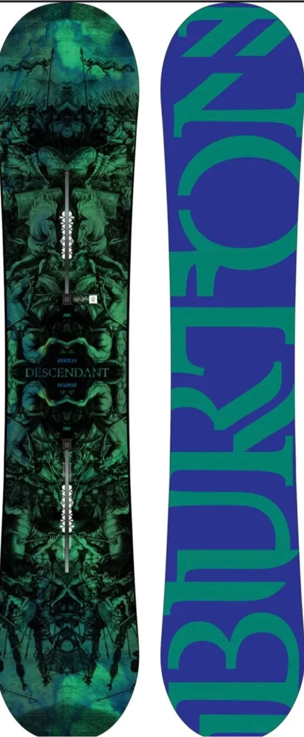 Selling a Burton Descendant snowboard. It features a unique graphic design with green and blue hues. Great for hitting the slopes!