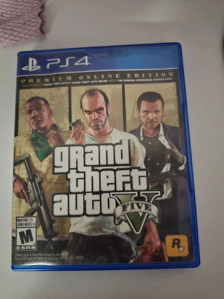 Selling Grand Theft Auto V for the PlayStation 4! It's the Premium Online Edition, which includes Grand Theft Auto Online and The Criminal Enterprise Starter Pack. The game is rated M for Mature 17+ by the ESRB. Get ready to dive into the criminal enterprise!