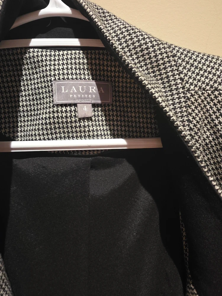 Selling a Laura Petites blazer in a classic houndstooth pattern! It's a size 4 and would be a great addition to any wardrobe