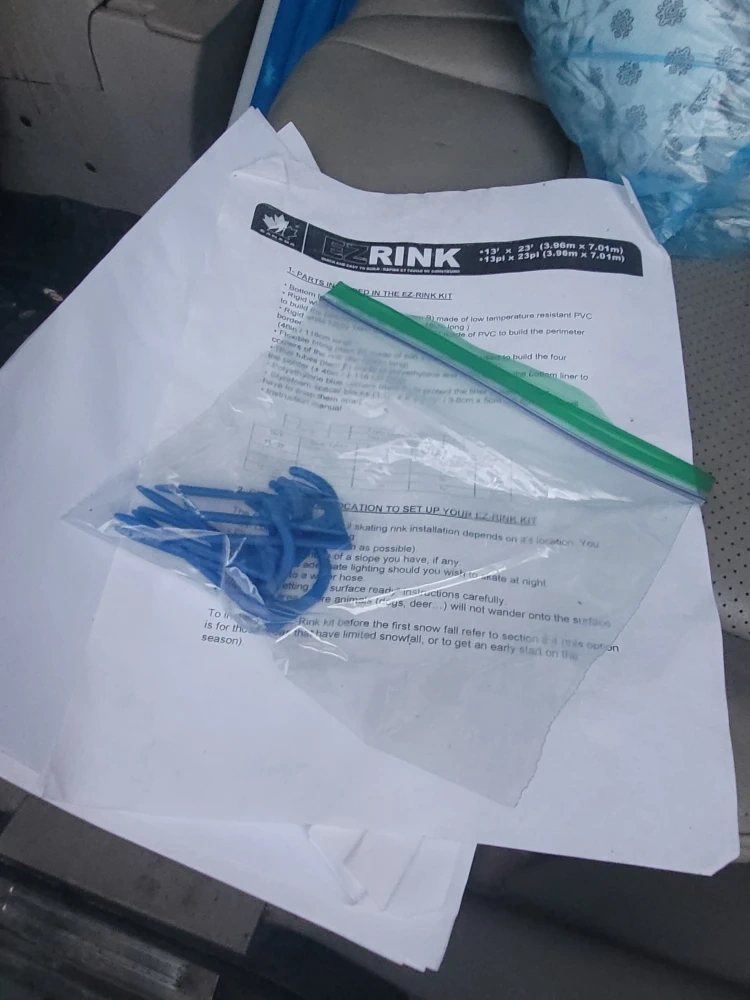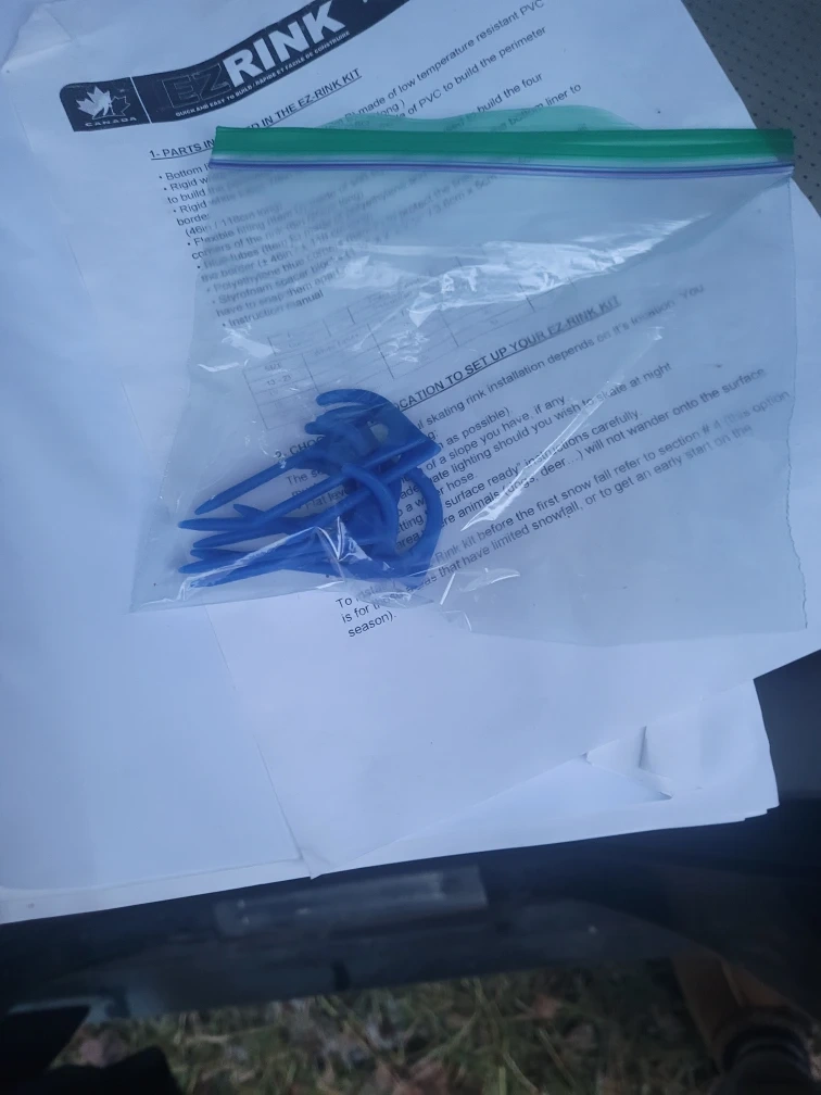 Get ready for some winter fun with this EZ Rink ice rink kit! It includes the bottom liner, flexible tubing, blue corner sleeves, and stakes to secure everything in place. The kit also comes with an instruction manual to help you set it up easily. Perfect for creating your own backyard skating rink!