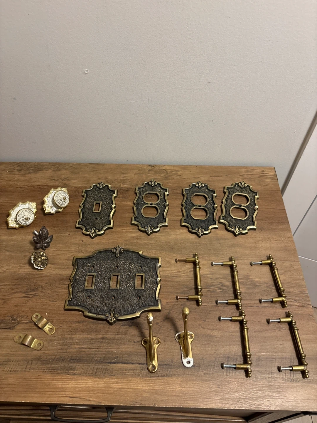 Selling a set of vintage-style bronze and bray wall plates and cabinet pulls. They're in good condition and would add a unique touch to any room! Includes single, double, and triple switch plates