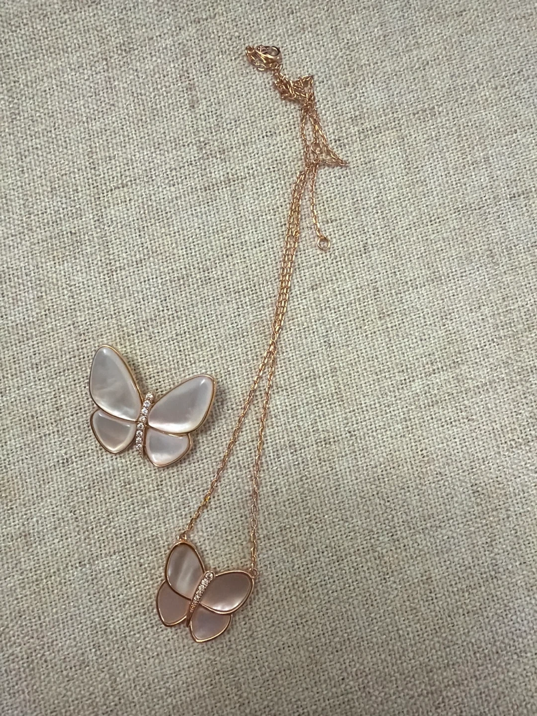 Selling a beautiful butterfly pendant necklace and brooch set. The set features delicate butterfly designs with a rose gold finish. Perfect for adding a touch of elegance to any outfit!
