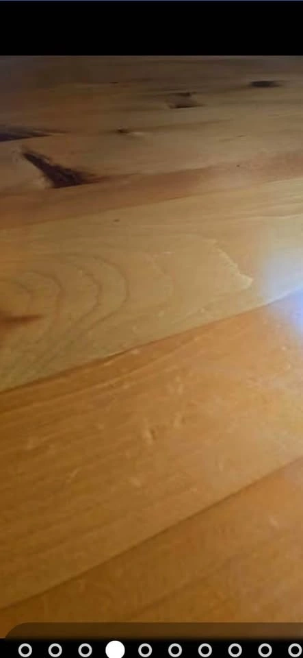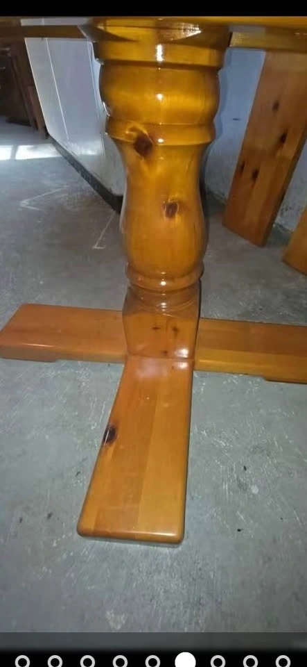 42x42x32 Round farmhouse solid wood dining table with high gloss finish, pedestal base and two 12" leaf inserts. Note: Some scratches and surface wear.