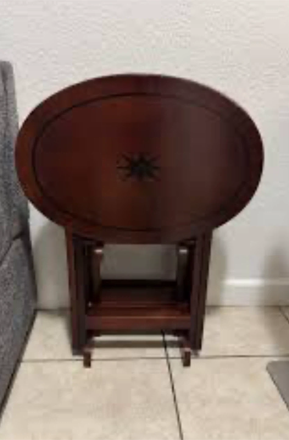 This is a lovely folding side table with a dark wood finish. It's perfect for small spaces and easy to store when not in use! The table has a unique design on top.