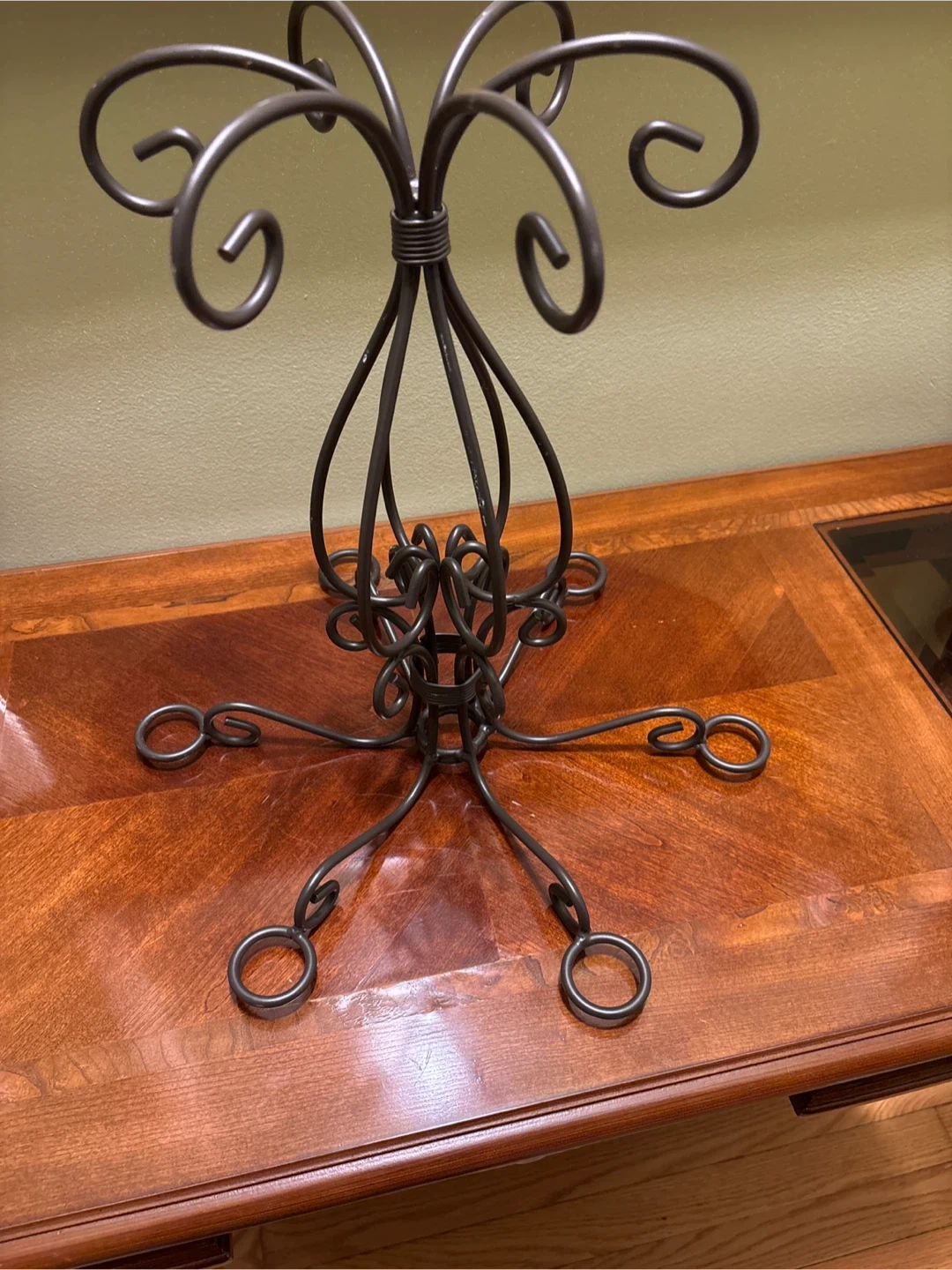 Here's a metal ornament display stand! It's in great condition and ready to showcase your favorite ornaments or small decorative items. The stand has a unique design with curled arms and circular hooks, perfect for adding a touch of elegance to your space