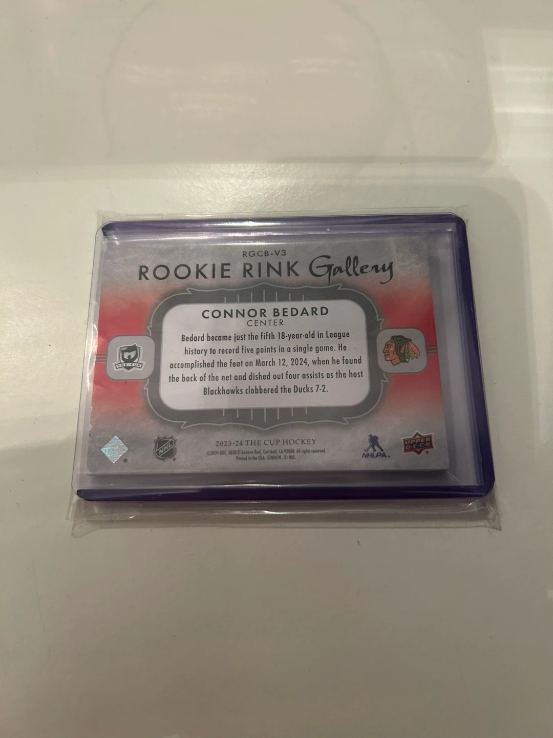 Selling a Connor Bedard Rookie Rink Gallery hockey card! It's from the 2023-24 The Cup Hockey series. The card commemorates Bedard becoming just the fifth 18-year-old in League history to record five points in a single game. He accomplished the feat on March 12, 2024, when he found the back of the net and dished out four assists as the host Blackhawks clobbered the Ducks 7-2. This is numbered 78/99