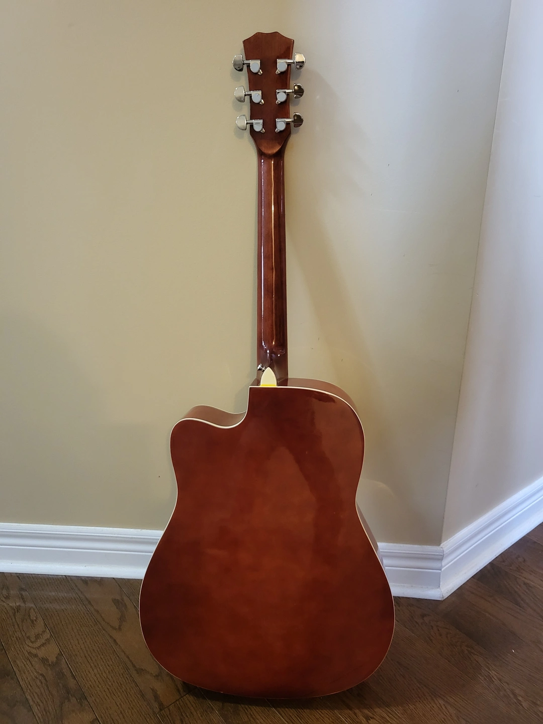 Get started on your musical journey with this brand-new, full-size acoustic guitar. It's the perfect beginner or student instrument, featuring a classic cutaway design and a natural high-gloss finish.
