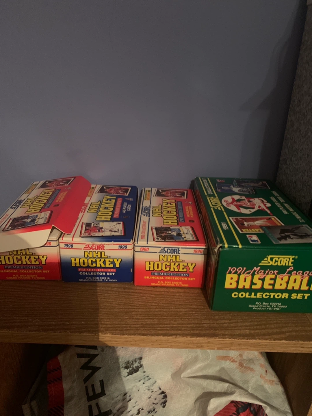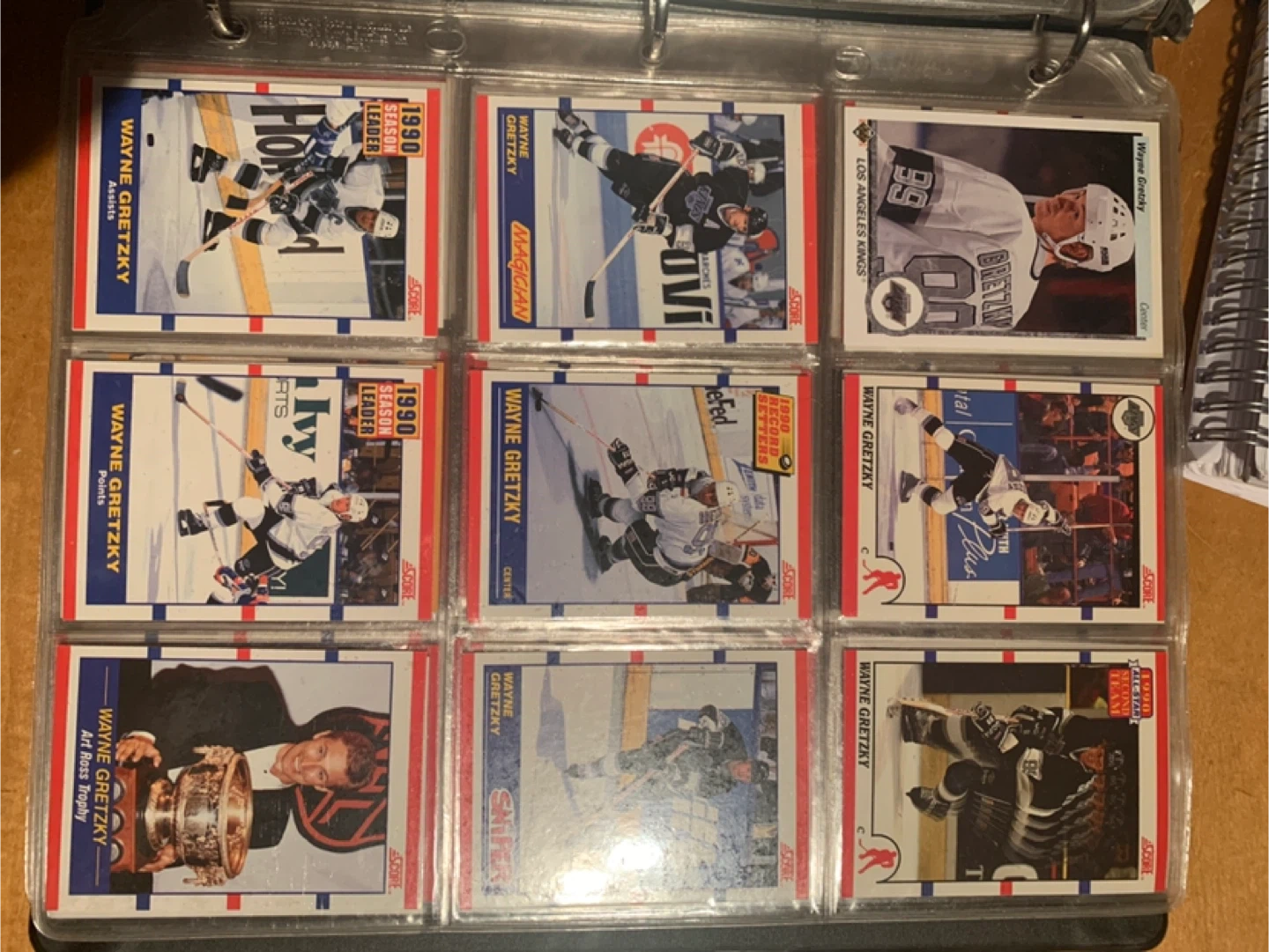 Selling a collection of vintage NHL hockey trading cards featuring players like Mario Lemieux, Wayne Gretzky, and Joe Sakic. The cards are from various sets, including Upper Deck and Score. Great for any hockey fan or collector!