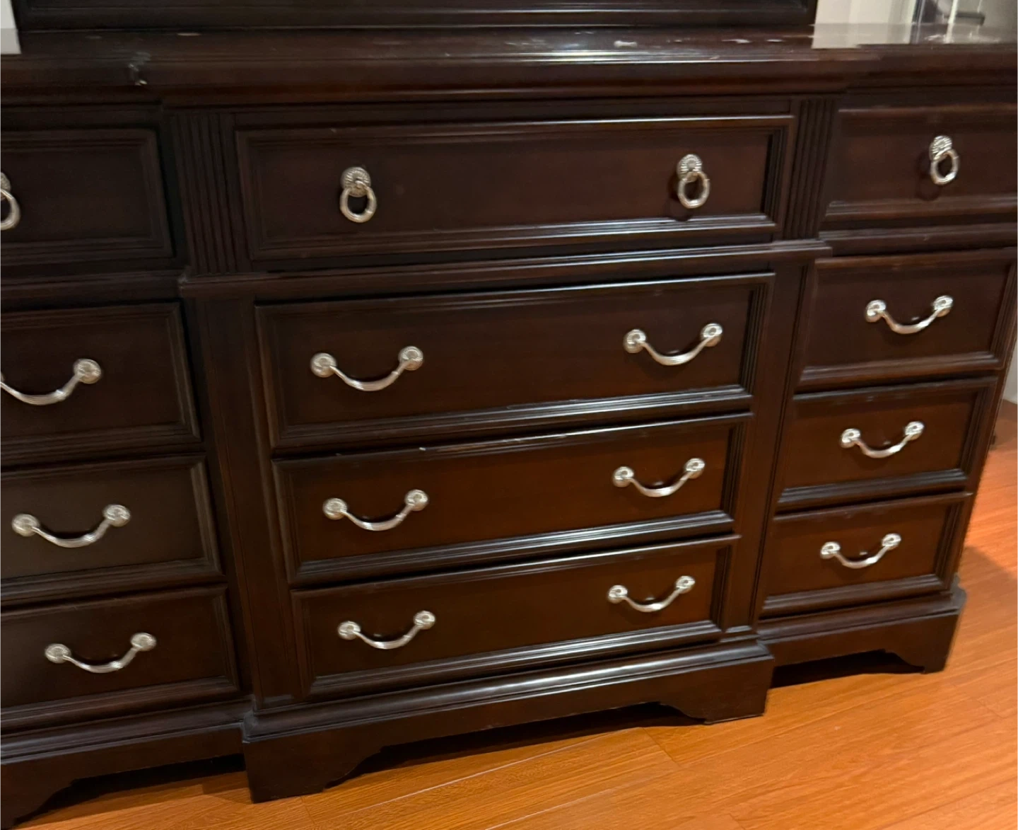 Selling a dark brown wood dresser with an attached mirror. It has multiple drawers for ample storage. There are some signs of wear and use on the top surface.