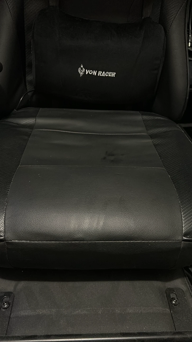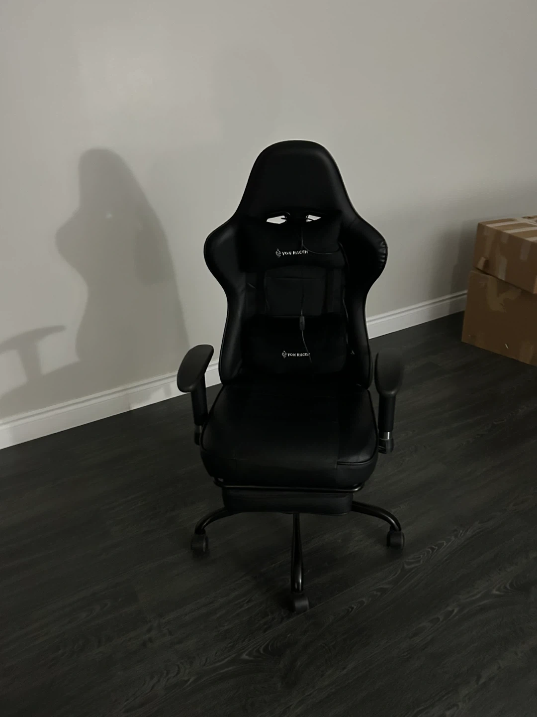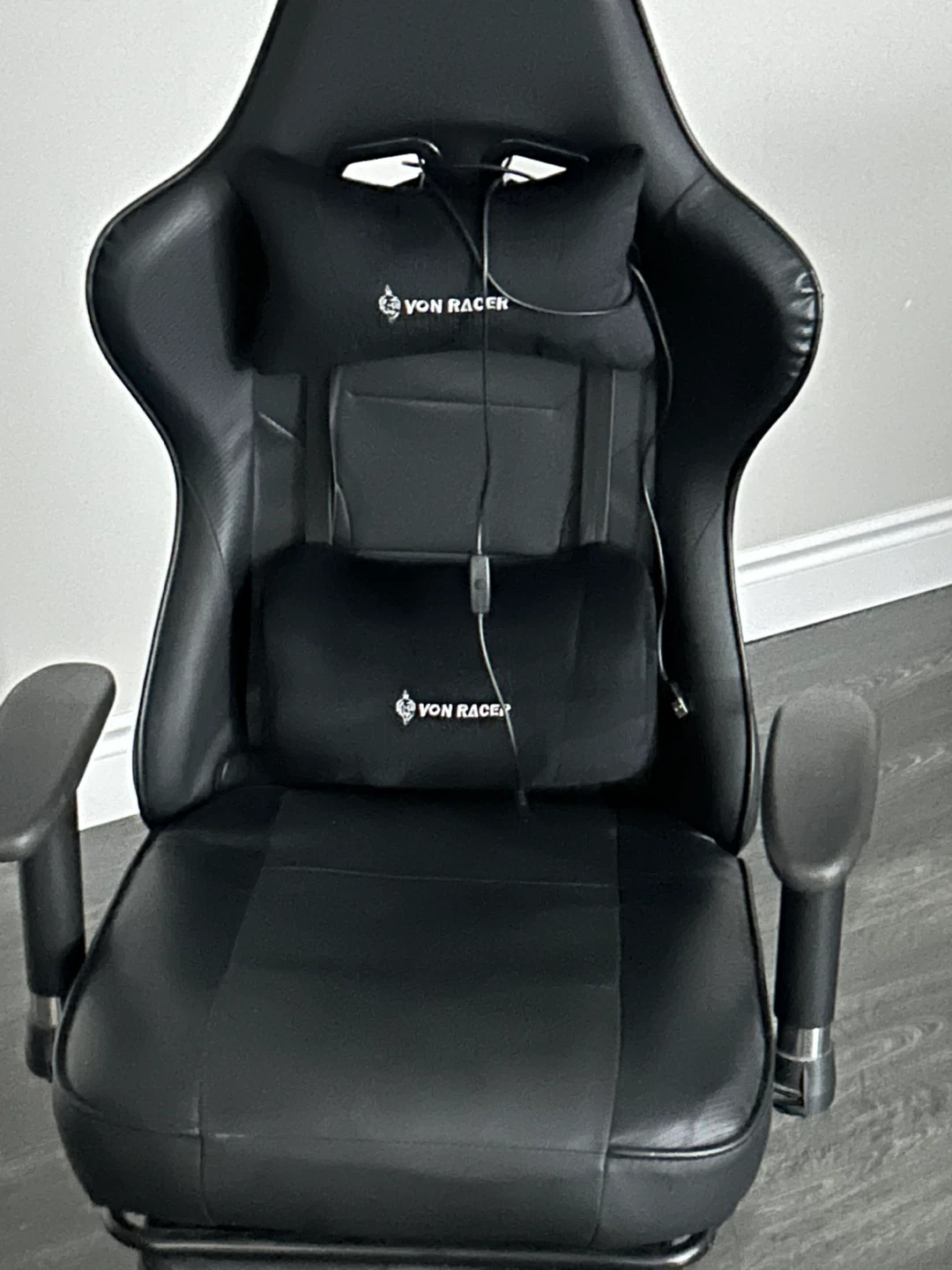 Selling a Von Racer gaming chair in black. It's in great shape and super comfy for long gaming sessions or working from home. Comes with the head and lumbar support pillows too!