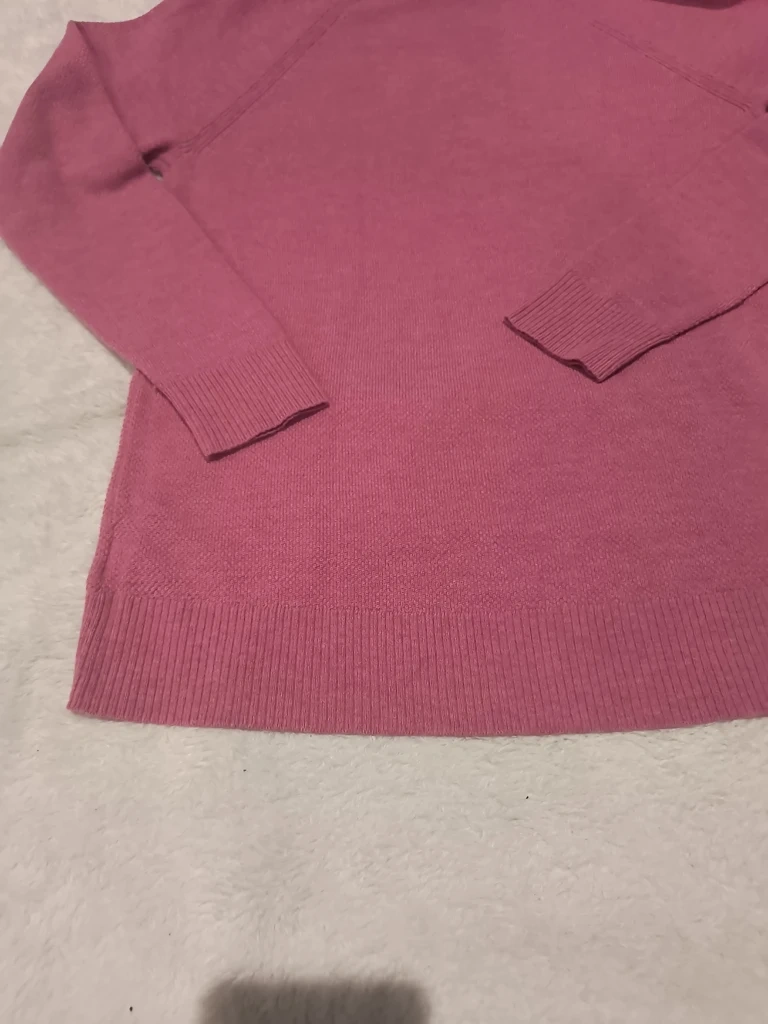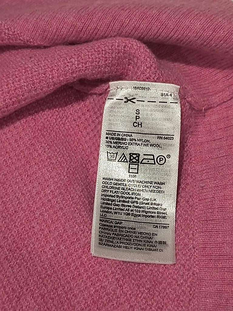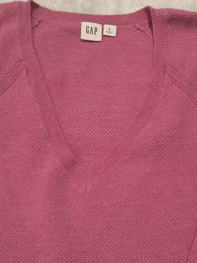 Selling a gently used GAP pink V-neck sweater in size small. It's made of 55% nylon, 30% merino extra fine wool, and 15% acrylic. Perfect for layering or wearing on its own!