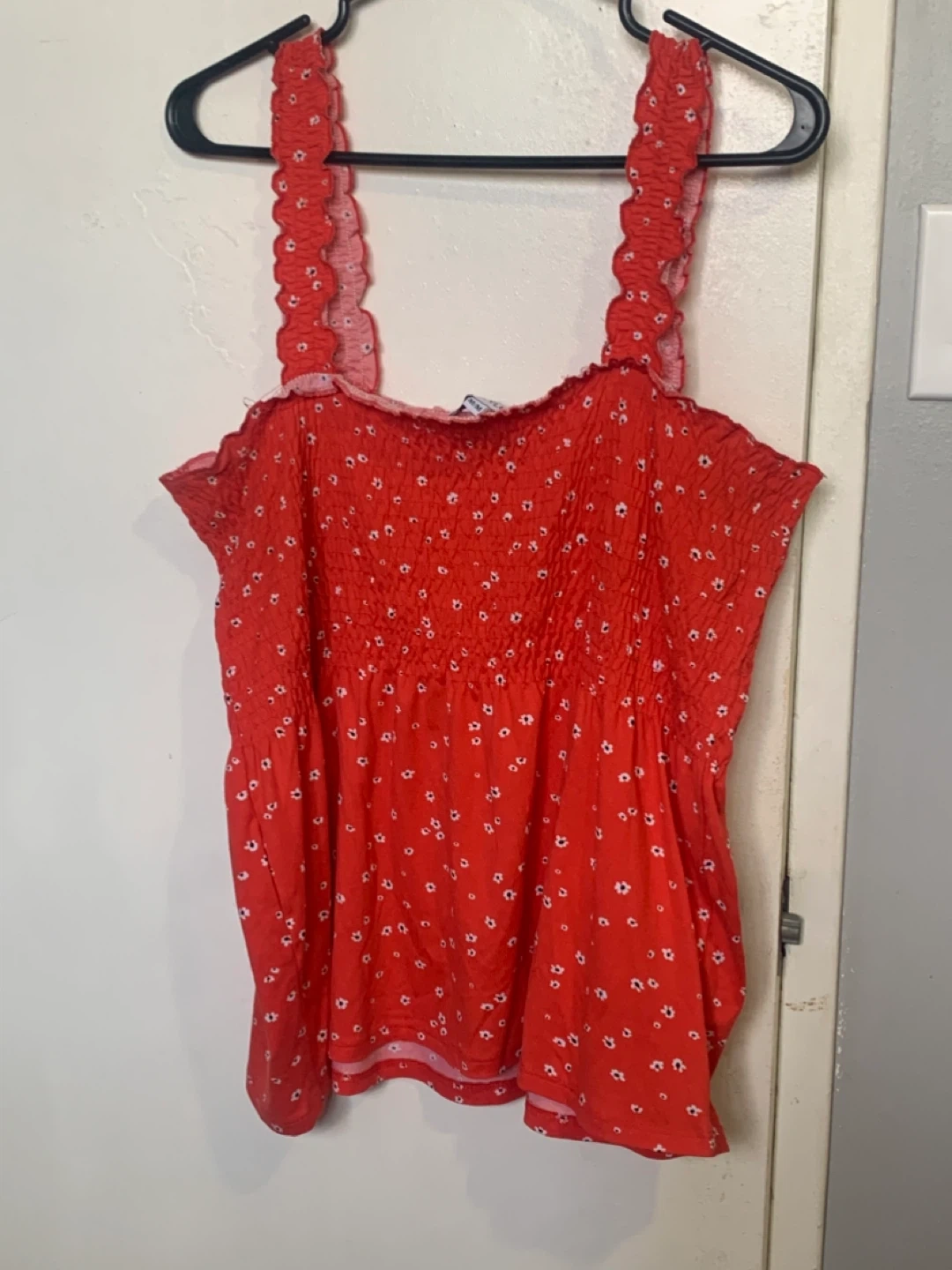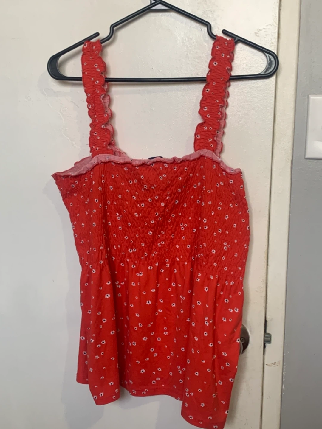 A cute mySTYLE tank top in vibrant red with a delicate white floral pattern. Perfect for summer days or layering under a cardigan when it gets a bit cooler.