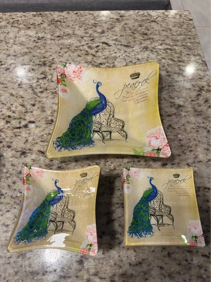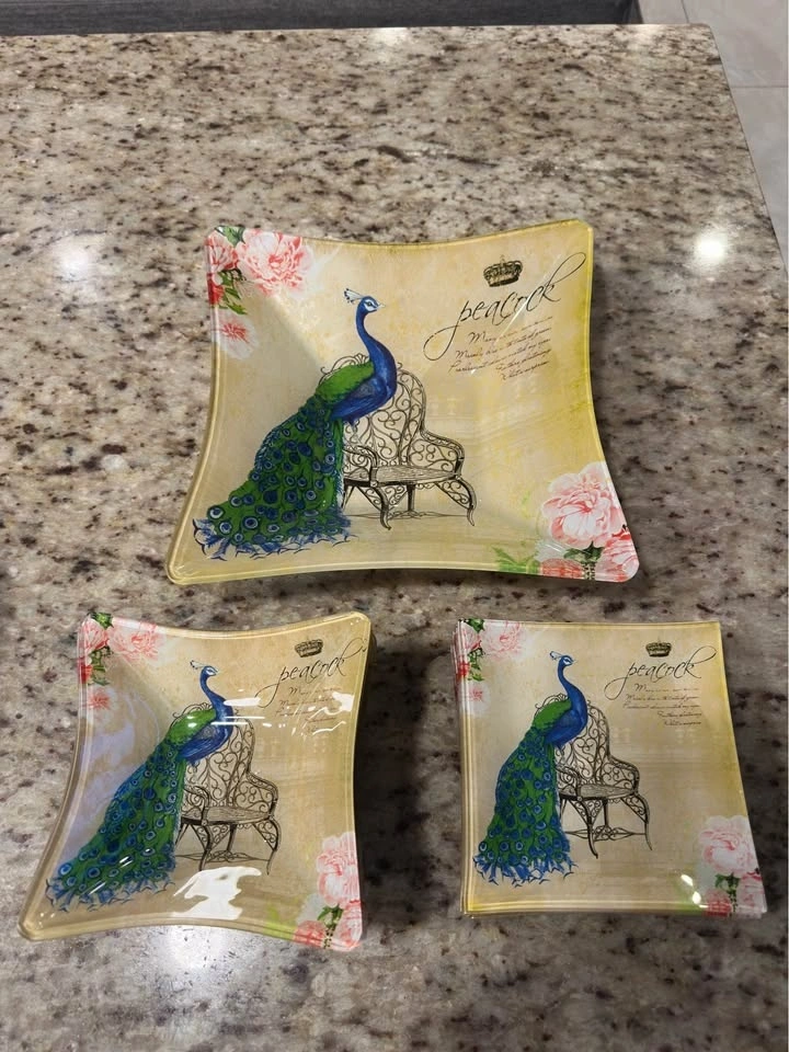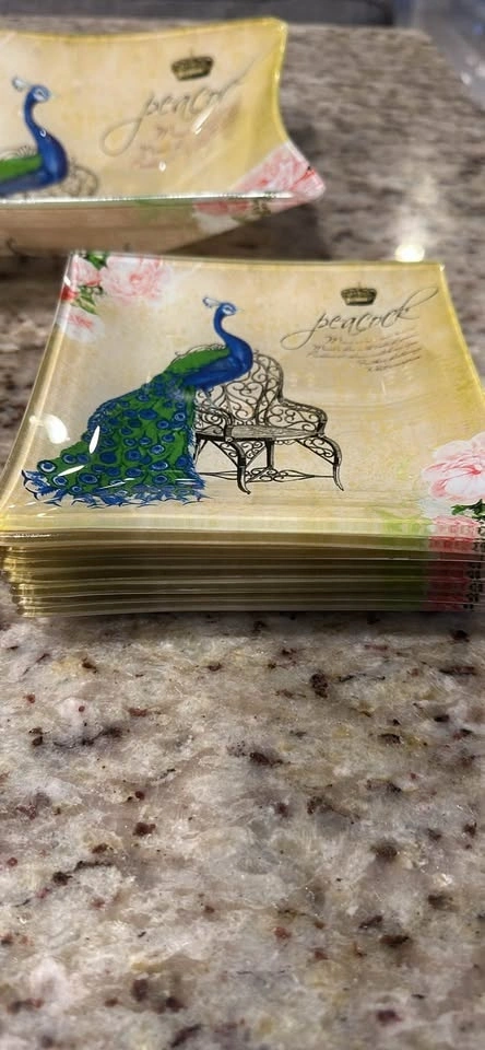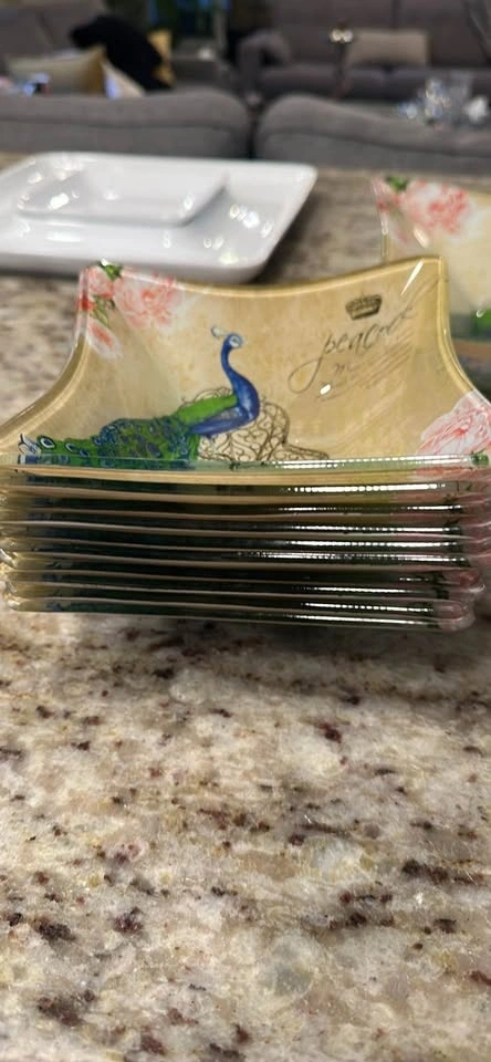 Brand new set of 8 small plates 8 bowls and 1 large decorative plates with peacock design. Still wrapped in plastic, never used. Food safe and great for decorative items!