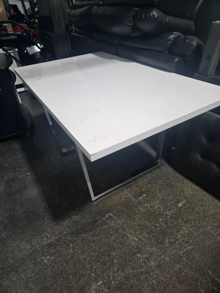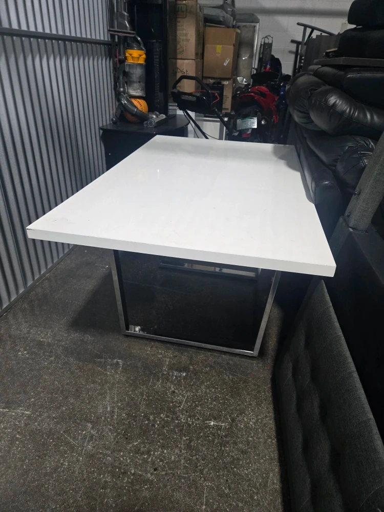 Selling a modern white dining table with a sleek chrome base. It measures approximately 149.86cm in length, 88.9cm in width, and 76.2cm in height. The table is in good condition and would be a stylish addition to any dining room