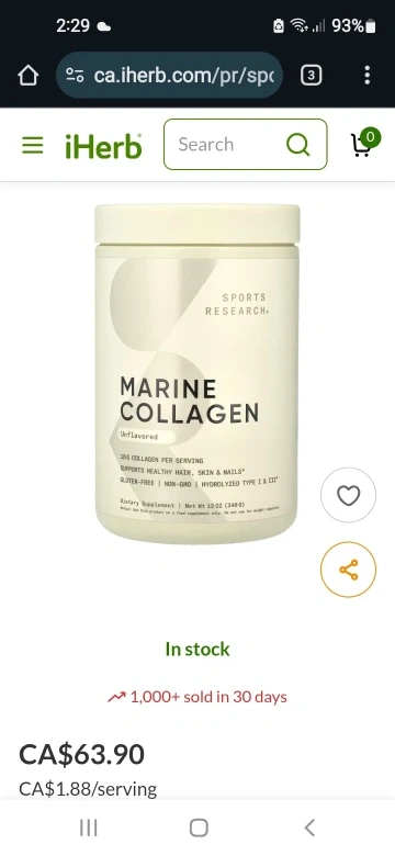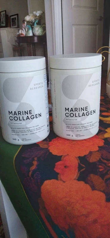 Selling a container of Sports Research Marine Collagen, unflavored! It contains 5000mg of hydrolyzed collagen per scoop and supports healthy hair, skin, and nails. The expiration date is July 2028.