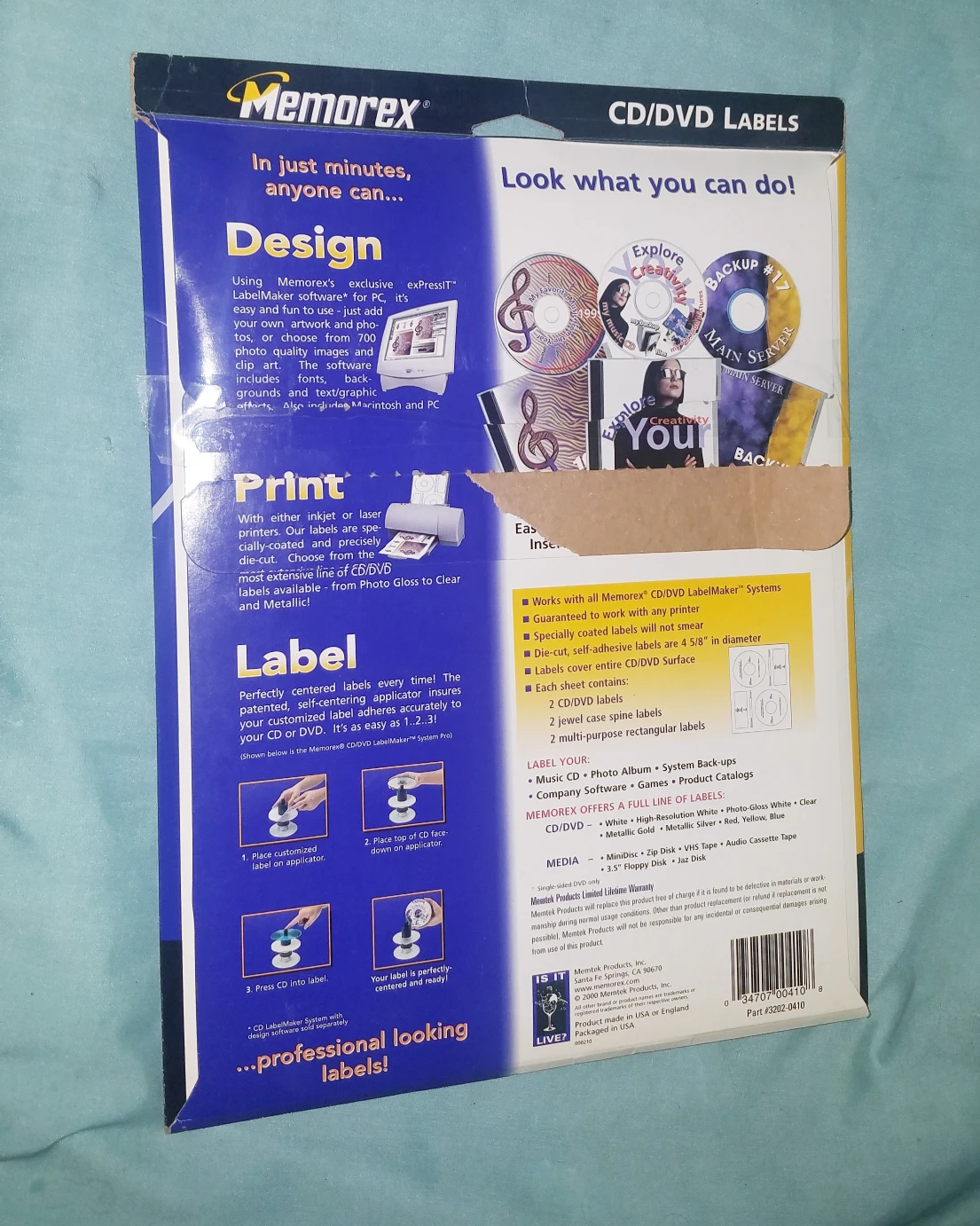 1 / 21 / 2Buy & Sell40 Memorex CD DVD Labels Sheets In Opened 100 White Label Pack40 Memorex CD DVD Labels Sheets In Opened 100 White Label Pack$1040 Sheets in an Opened 100 Sheet Pack No CD or Anything Else is Included Please See PicsConditionNewWHERE TO MEETStarbucksView MapSELLERverifiedRobMid Island761 review0 chats·0 favorites·2 viewsSEND CHAT TO SELLERHi Rob! I’m interested in your listing.Hi Rob! I’m interested in your listing.Get the Karrot app to chatSign In to chat