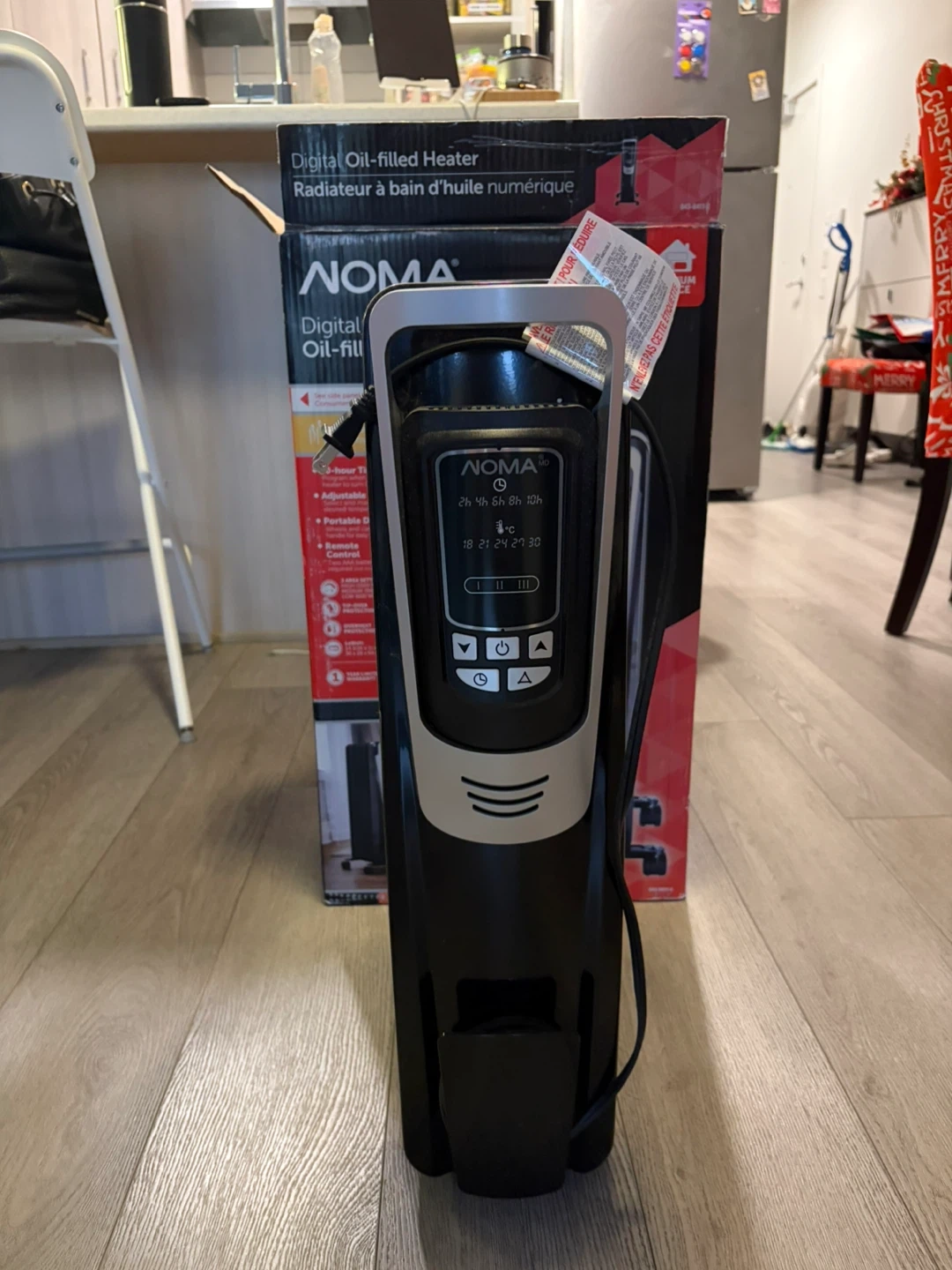 Selling a NOMA digital oil-filled heater! It comes with a 10-hour timer and adjustable thermostat. It's also portable, however remote is missing. Great for medium spaces and comes with the box!