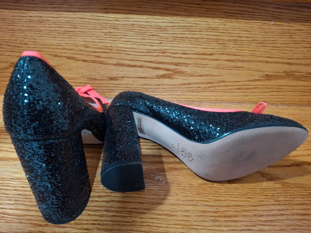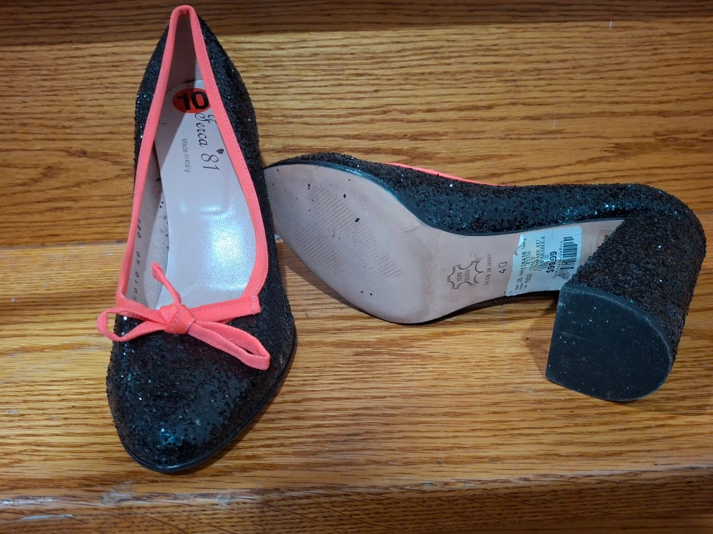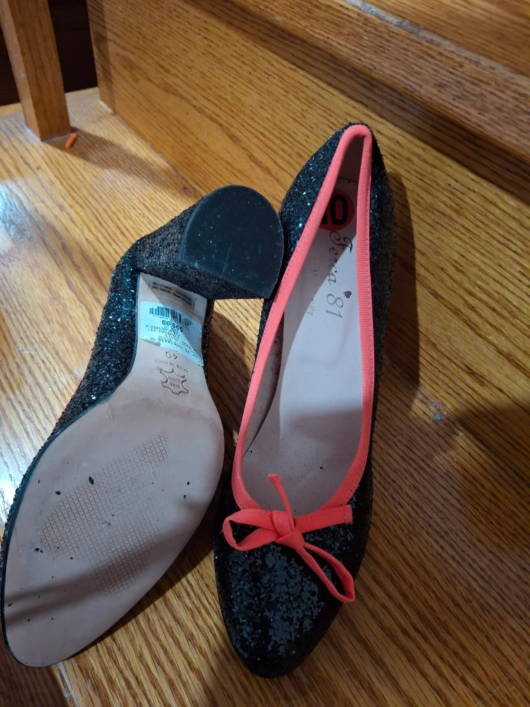 These Fiocca 81 heels are a fun addition to any outfit! They feature a black glittery exterior with a cute coral pink trim and bow. Size 10.