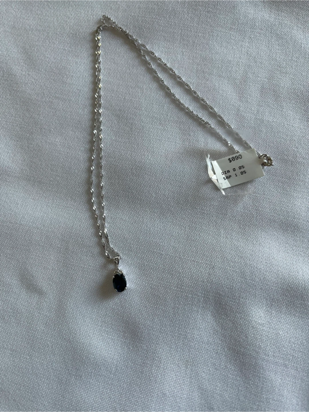 A delicate silver necklace featuring a sapphire and diamond pendant. The tag shows it was originally priced at $890. It's in great condition and ready to add a touch of elegance to any outfit!