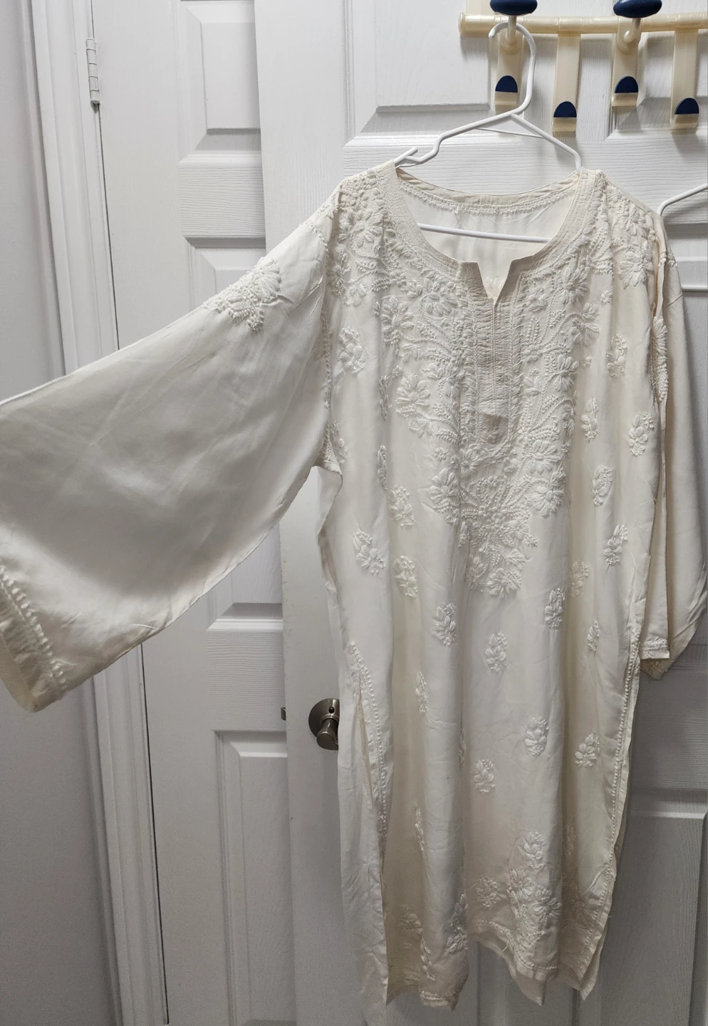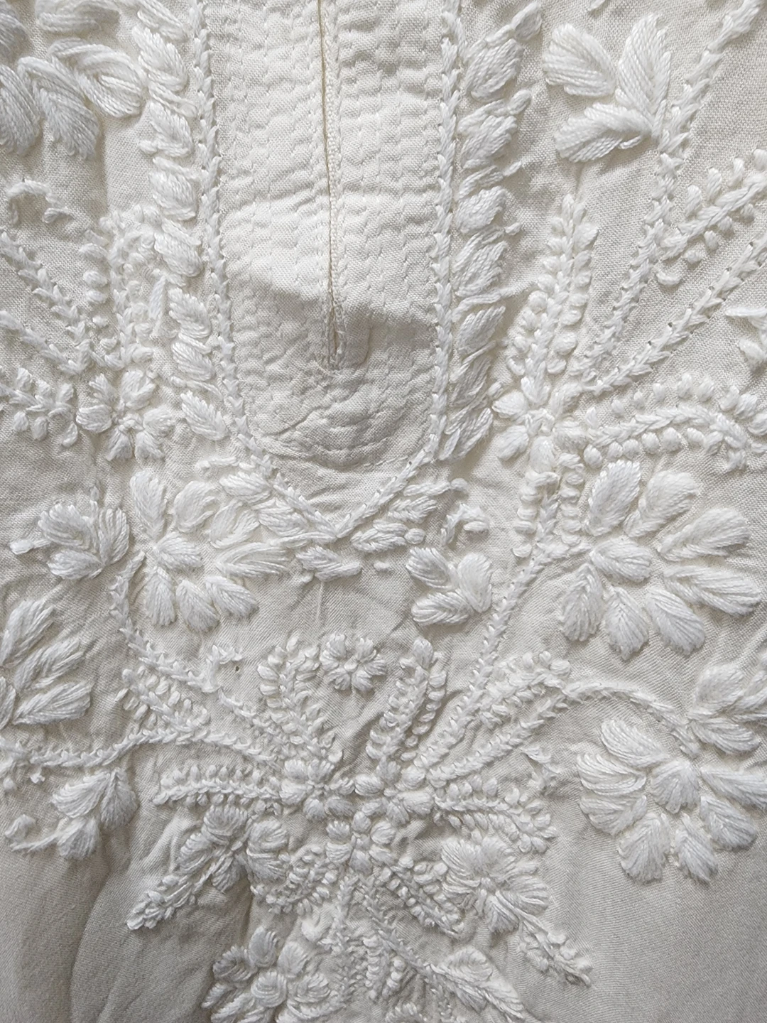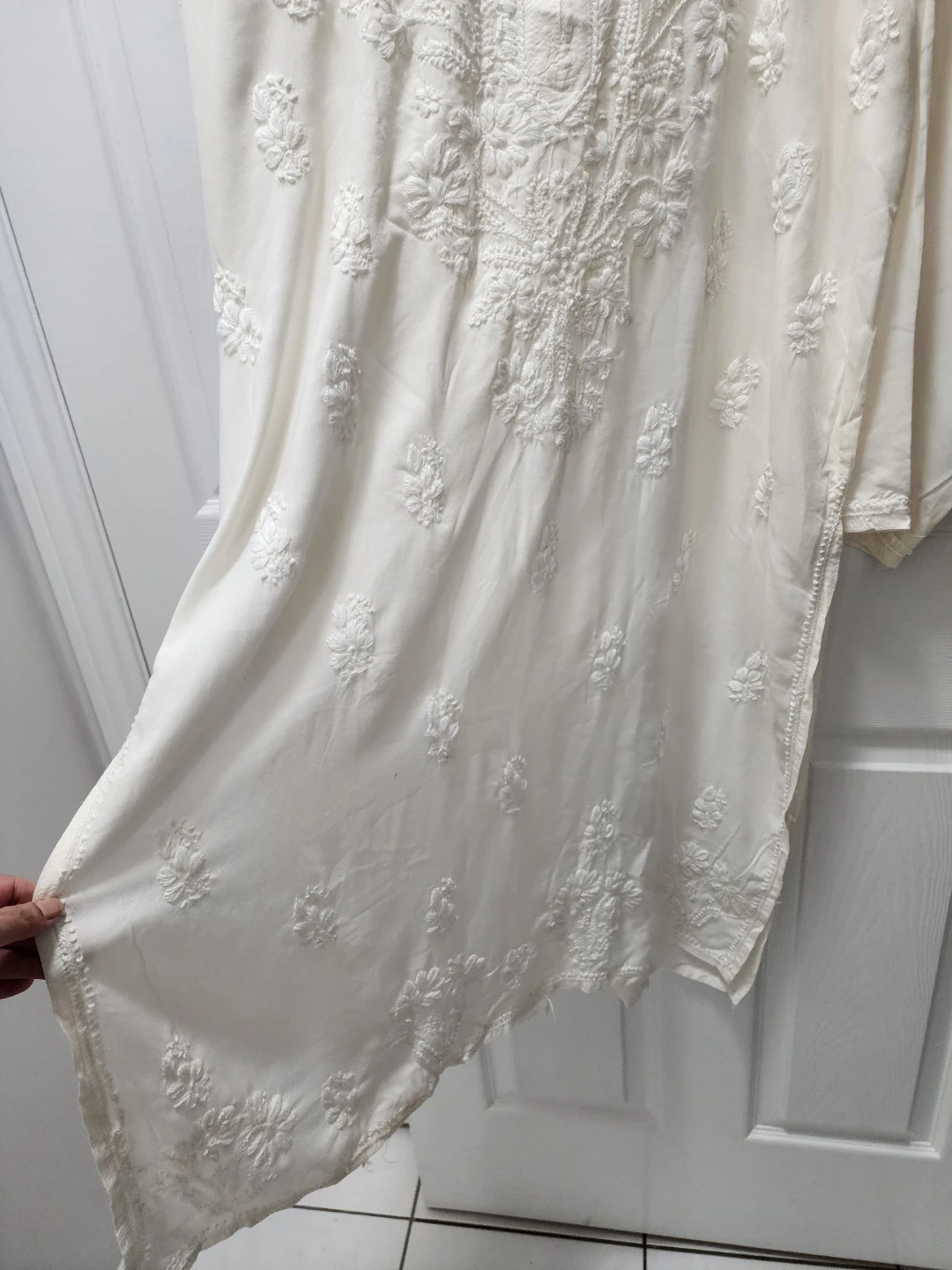 Selling a beautiful white embroidered kurti. It's in great condition and features delicate floral embroidery. The chest measures 26 inches and the length is 43 inches. Perfect for a casual or dressy occasion!