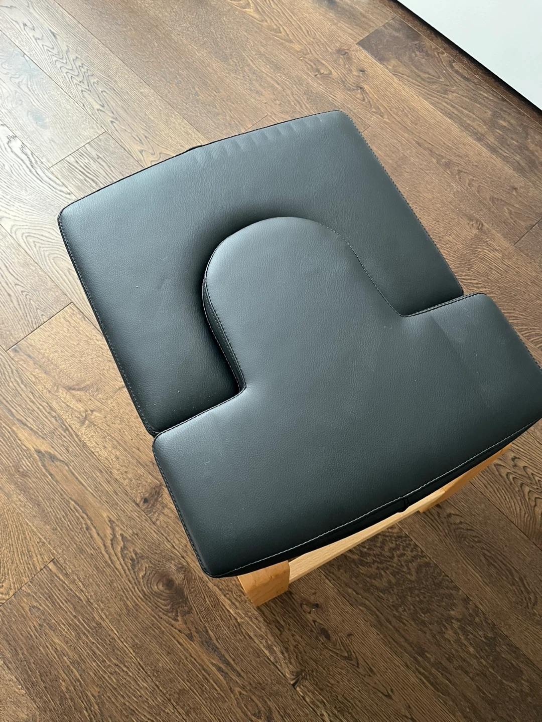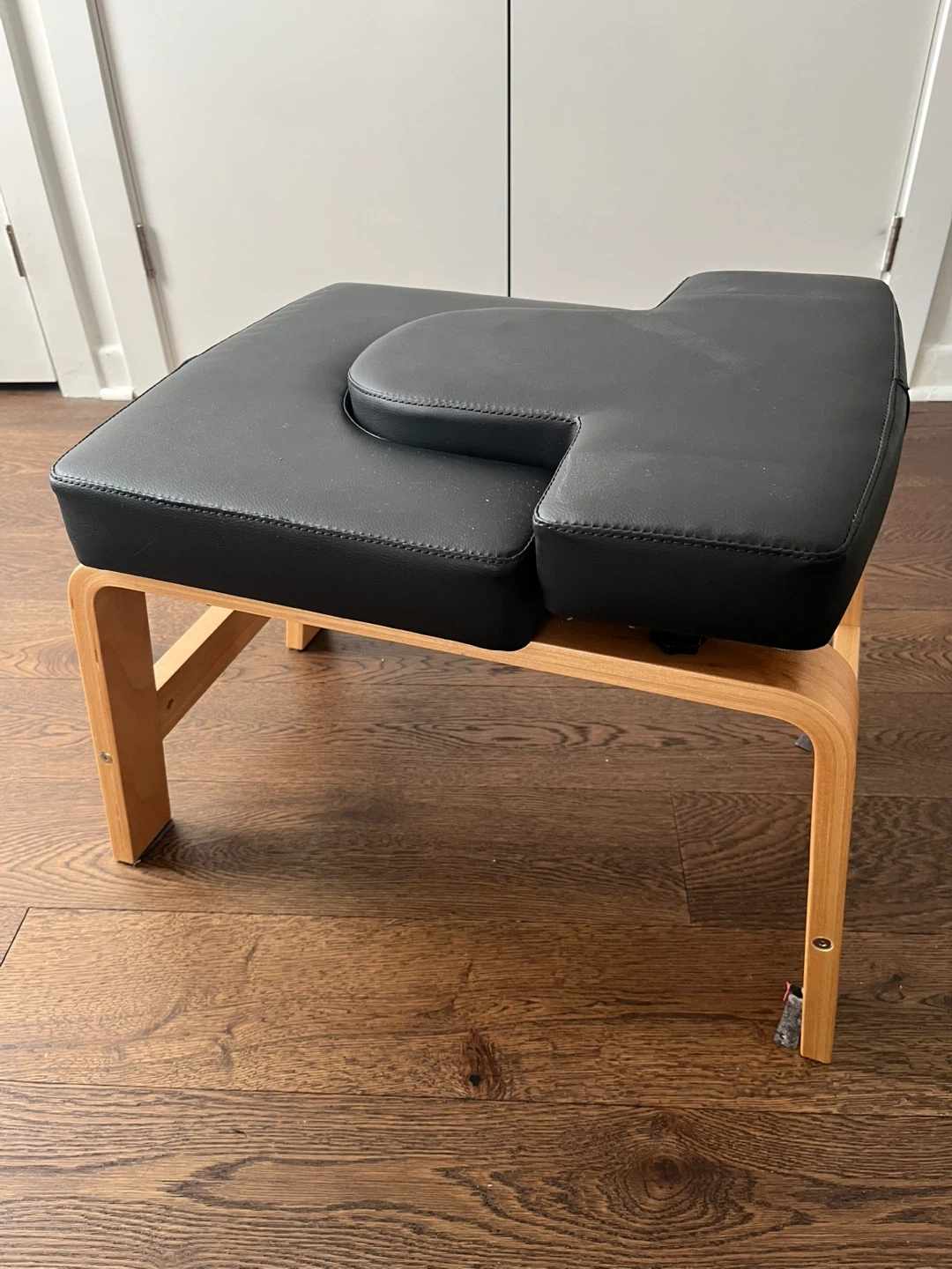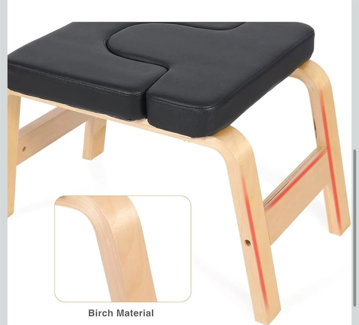 This yoga headstand bench is perfect for supporting you during inversions! It features a comfortable black padded seat and a sturdy birch wood frame. It can hold up to 330lb/150kg and weighs just 9lb/4kg. Dimensions are 17in/44cm x 25in/63cm.
