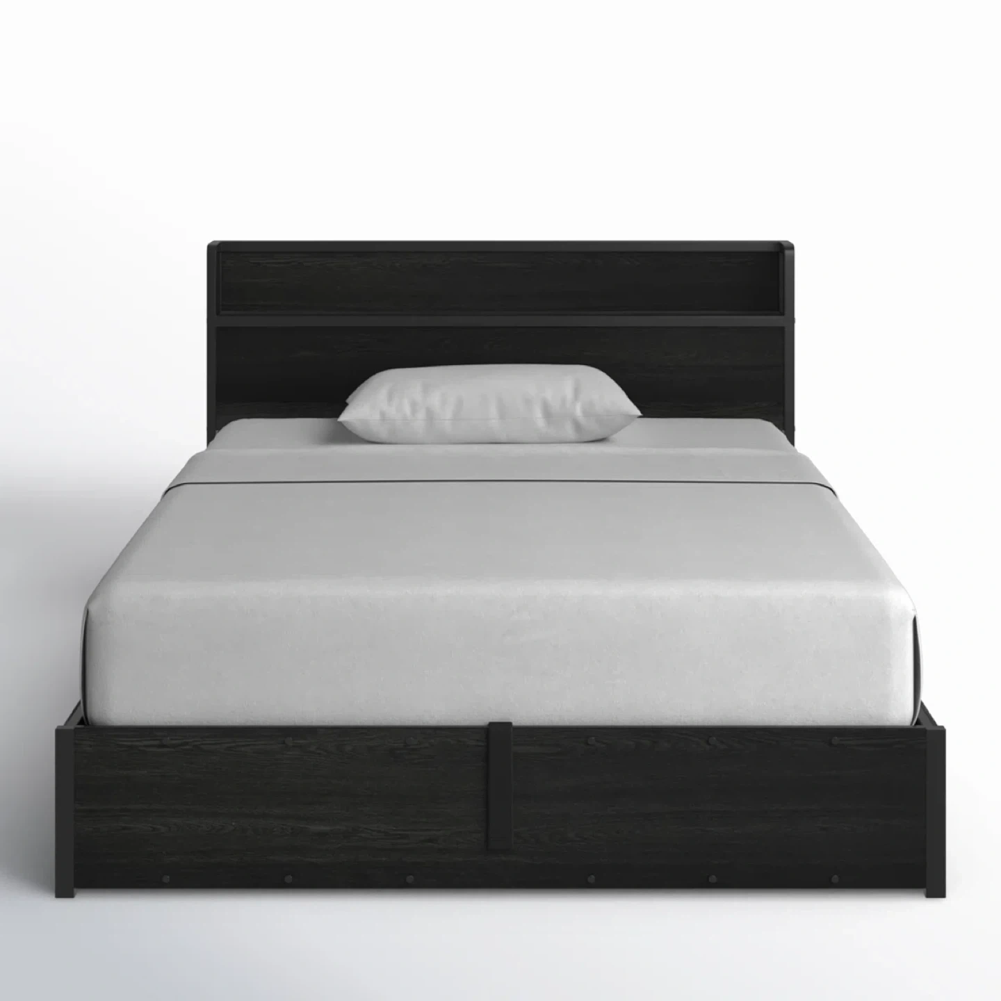This bed frame comes with a storage headboard and a charging station. It features 2 AC outlets (110V/12A) and 2 USB ports (5V/3A). The power cord is 6.6ft long. It's a great way to keep your devices charged and your bedroom organized