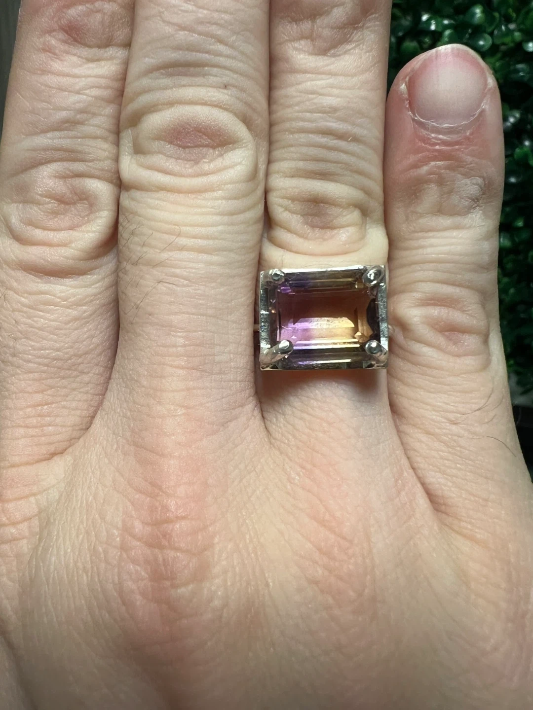 Here's a lovely rectangular Ametrine ring! The stone has a beautiful gradient of purple and yellow tones. It's a unique piece that would make a great addition to any jewelry collection. Size 6
