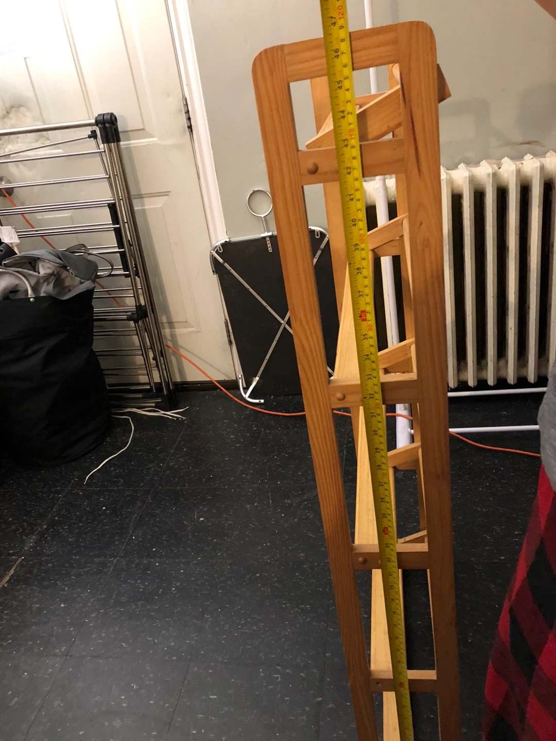Here's a wooden shoe rack to help keep your entryway tidy! It's in good condition and ready for a new home. It measures approximately 47 inches tall and 26 inches wide.