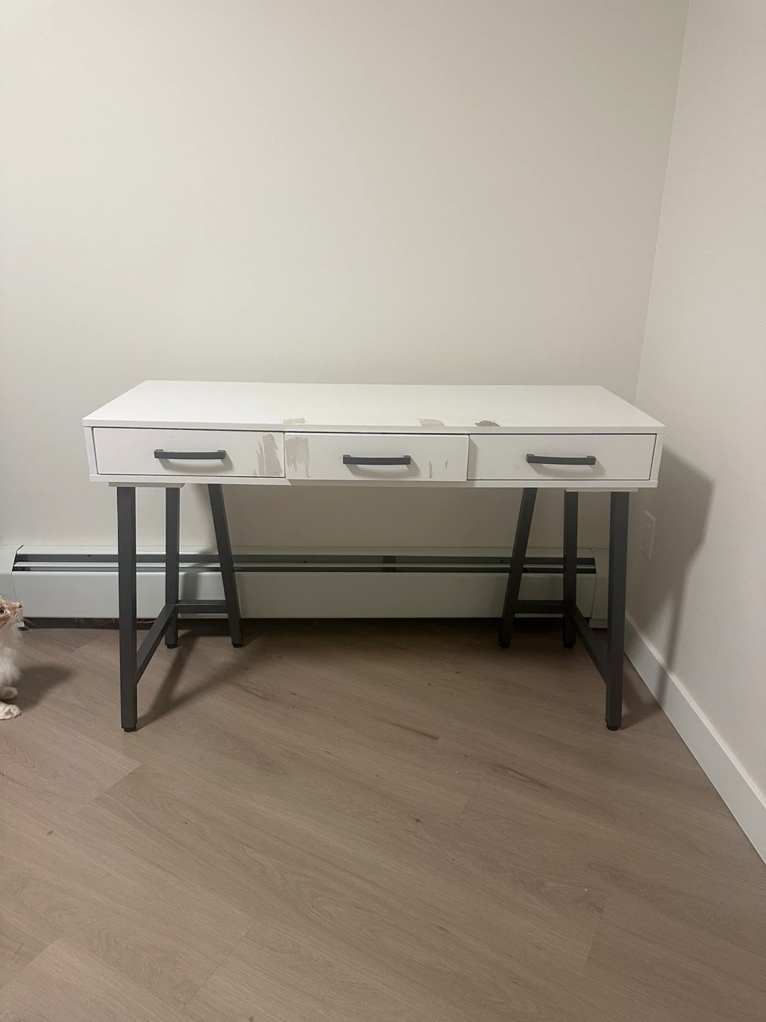 Selling a white desk that's perfect for a home office or study space! It has three drawers for storage. It has some marks from the paint being ripped off from a move but overall it's still in good condition and very functional