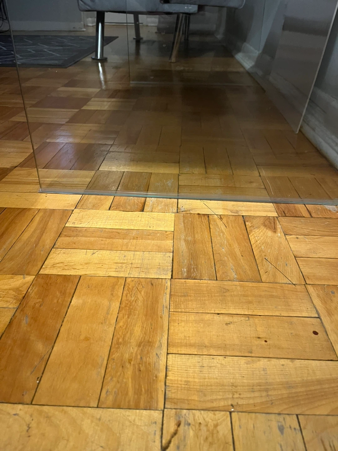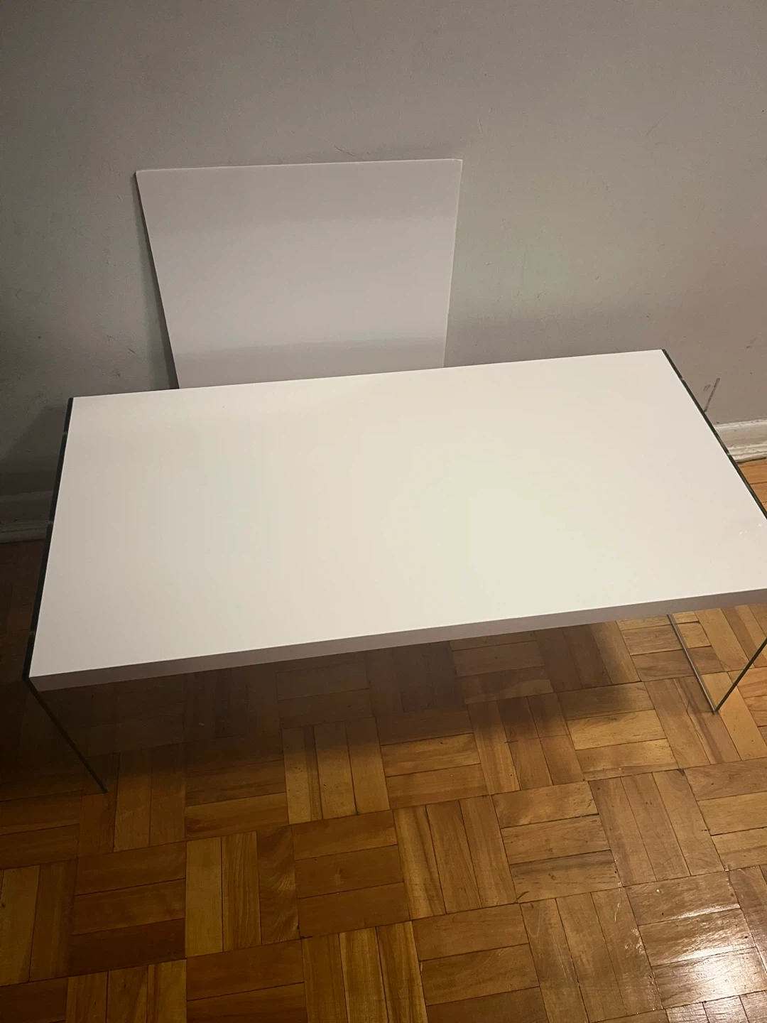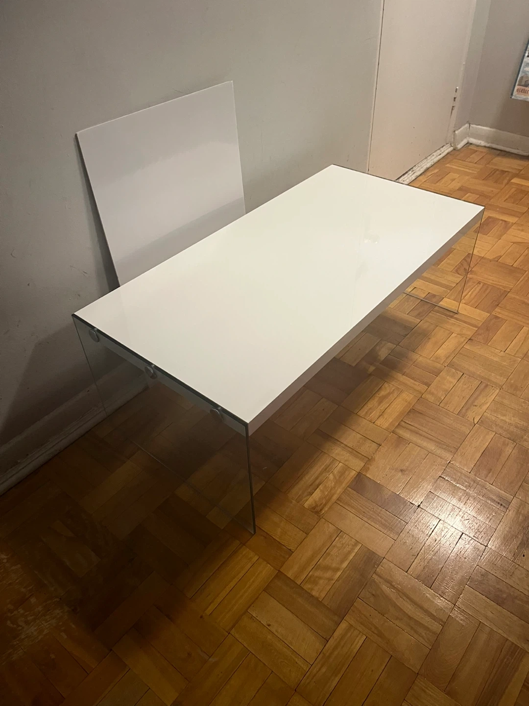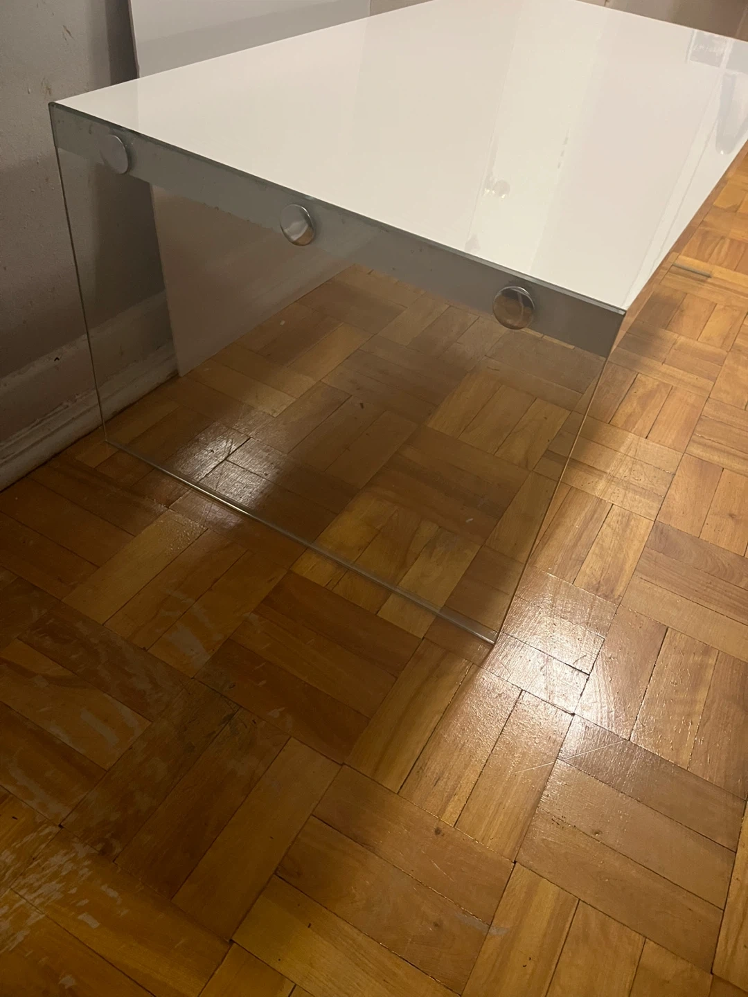 Stylish modern coffee table featuring a sleek white top and clear glass side panels. Its minimalist design fits perfectly with any living room décor, adding a clean and contemporary look to your space.