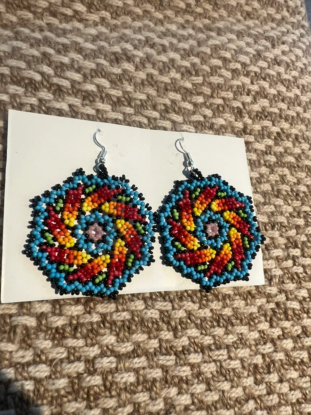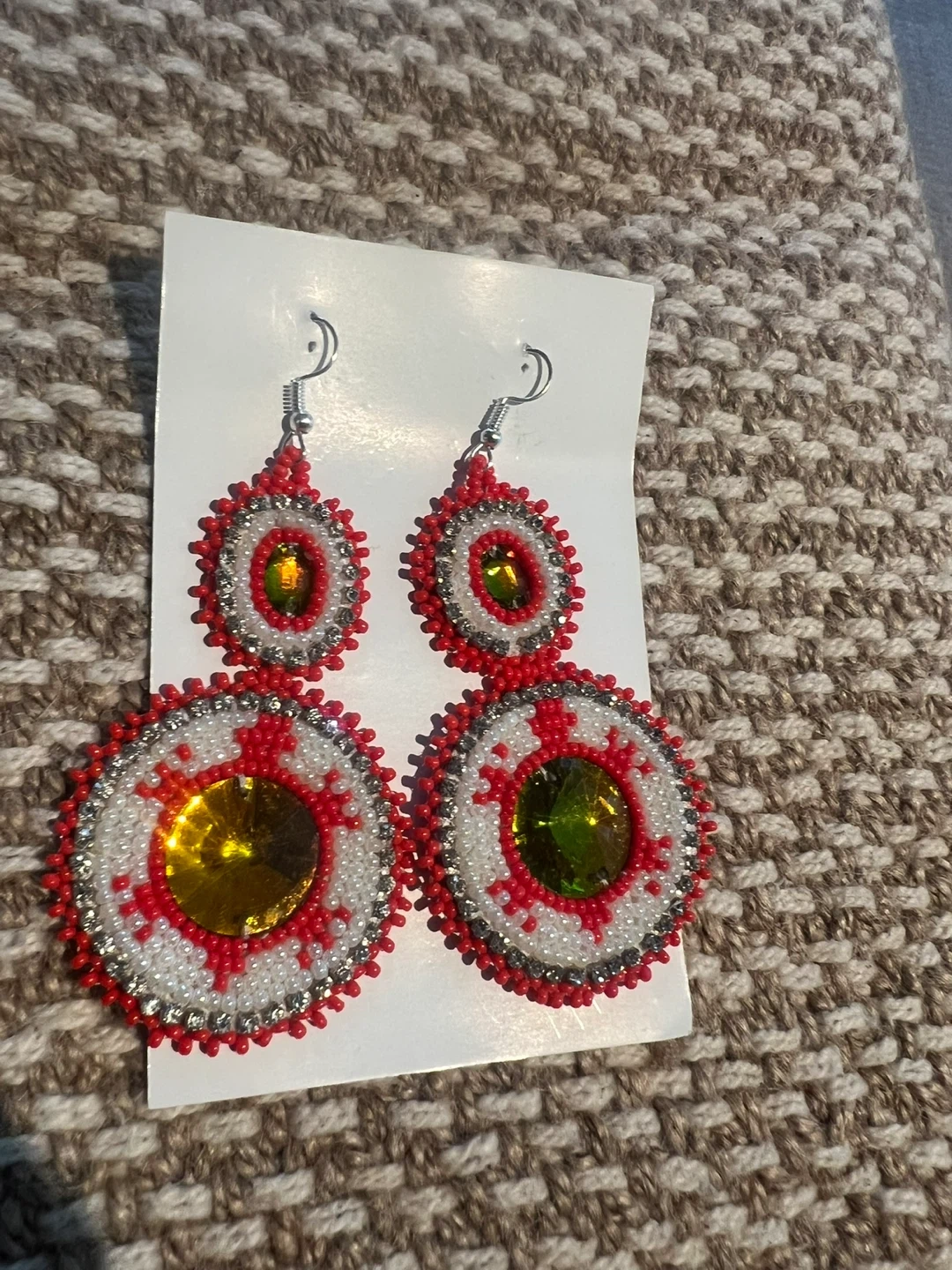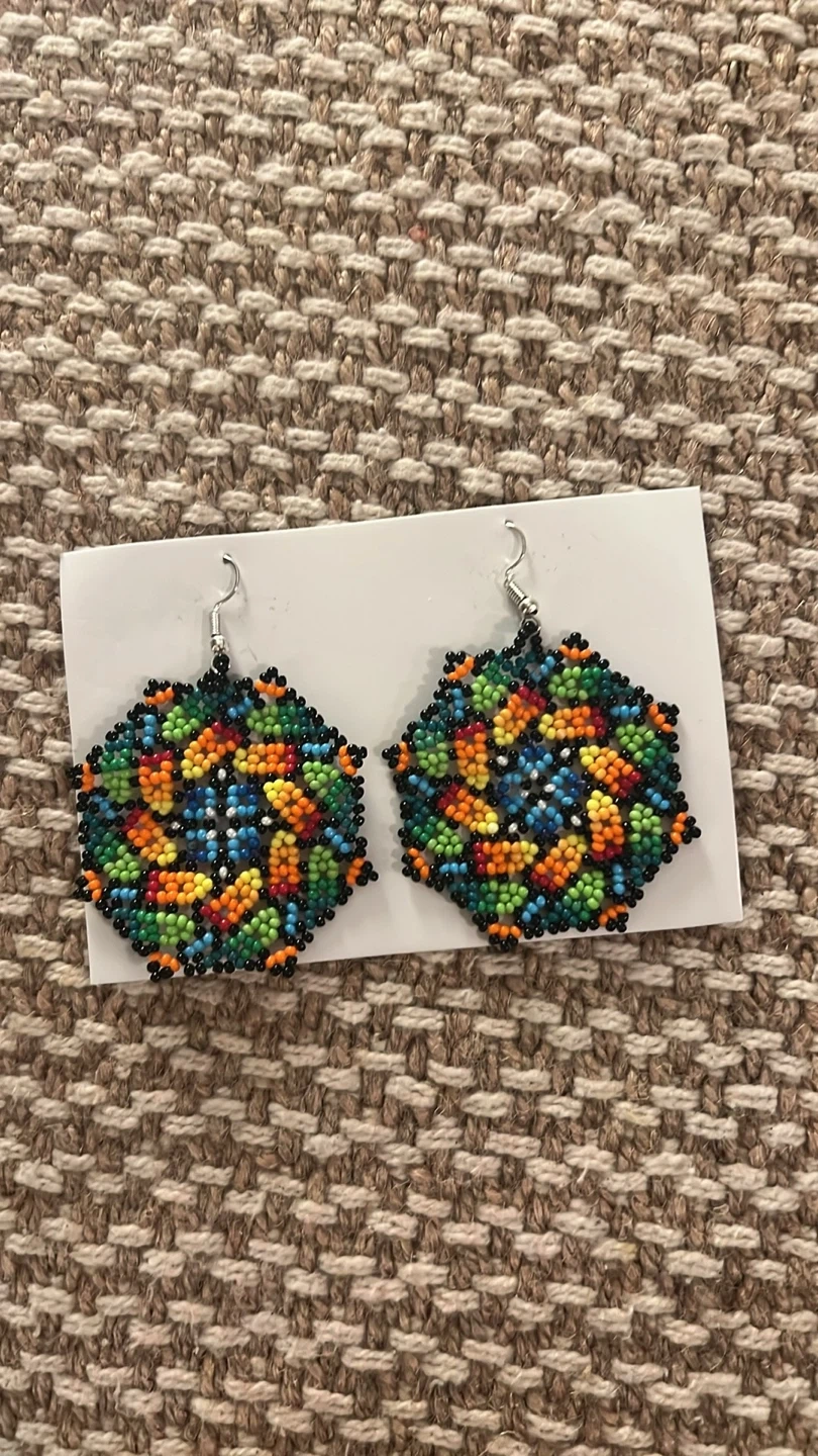 Check out these unique, handmade beaded earrings! They feature intricate designs and vibrant colours. Perfect to add a pop of colour to any outfit!