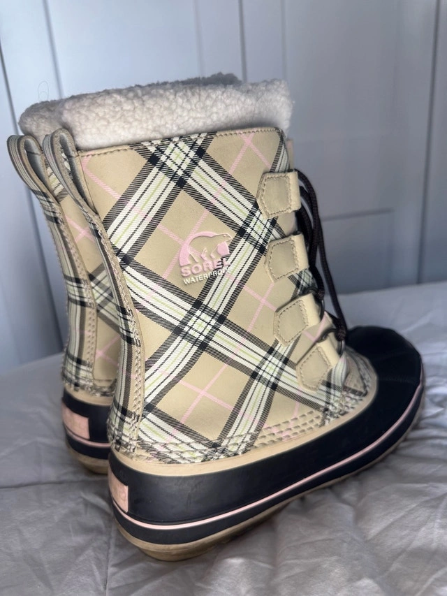 Fabulous Ladies Size 9 SOREL Waterproof Winter Boots, cream coloured with this beautiful pink tartan pattern. Purchased new boots so I decided I would sell these ones as they don’t match my winter coat used for one and a half seasons in a really good condition. Super comfortable and very waterproof Pick up in the lobby of my condo located in Scarborough at Finch and McCowan