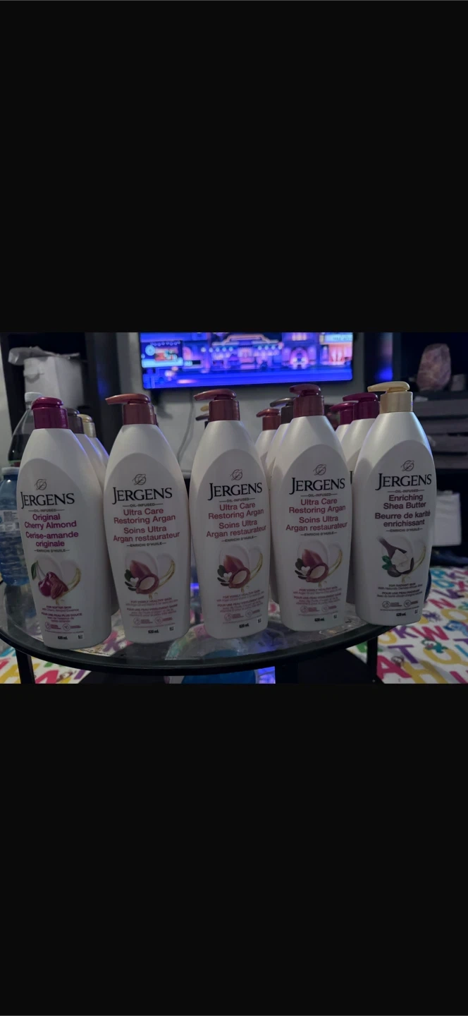 Selling a bundle of Jergens lotion! Includes the Original Cherry Almond, Ultra Care Restoring Argan, and Enriching Shea Butter varieties. All bottles are 625 ml