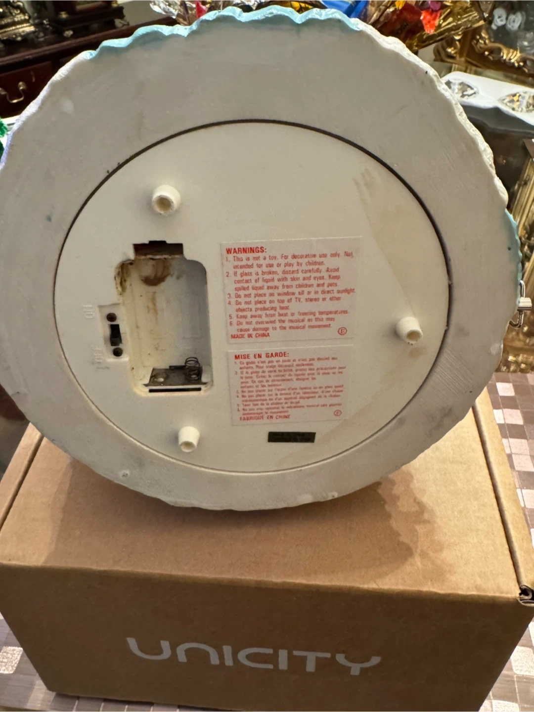 Selling a charming Christmas snow globe decoration! It features a lovely winter scene inside the globe and a decorative base with miniature houses and trees. It also plays music, adding to the festive atmosphere.