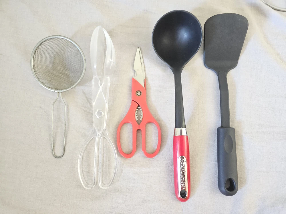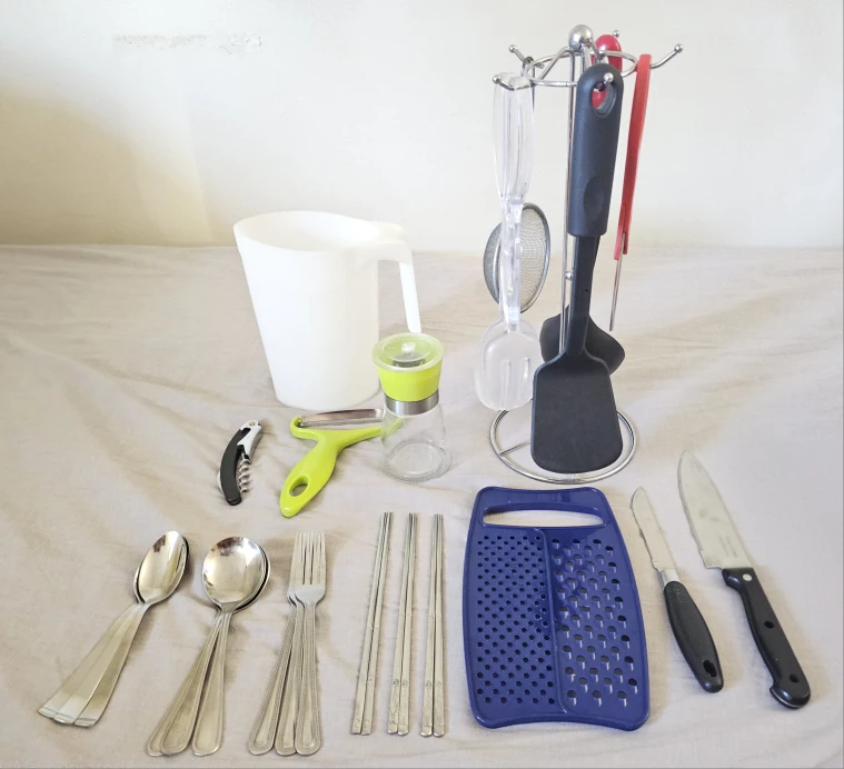 Selling a variety of kitchen utensils! Includes a pitcher, grater, spoons, forks, knives, and other helpful tools for cooking