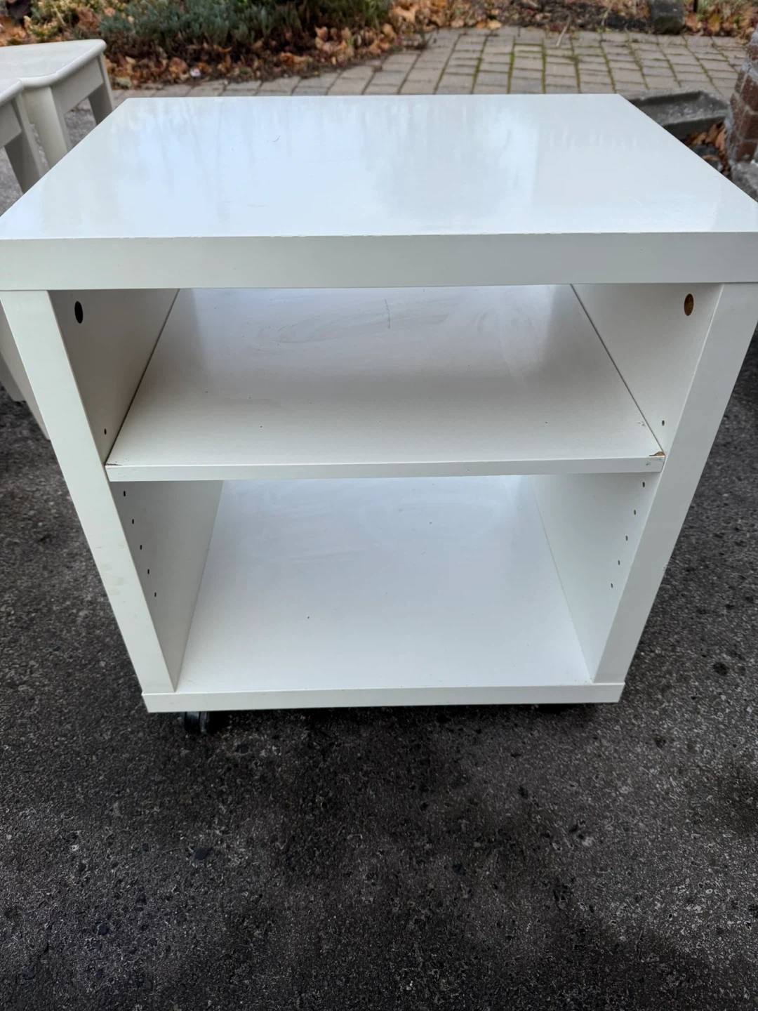 Sturdy white square side table on casters (wheels). Perfect as a rolling nightstand, a small media stand, or a storage unit in an office. Very functional piece of furniture!