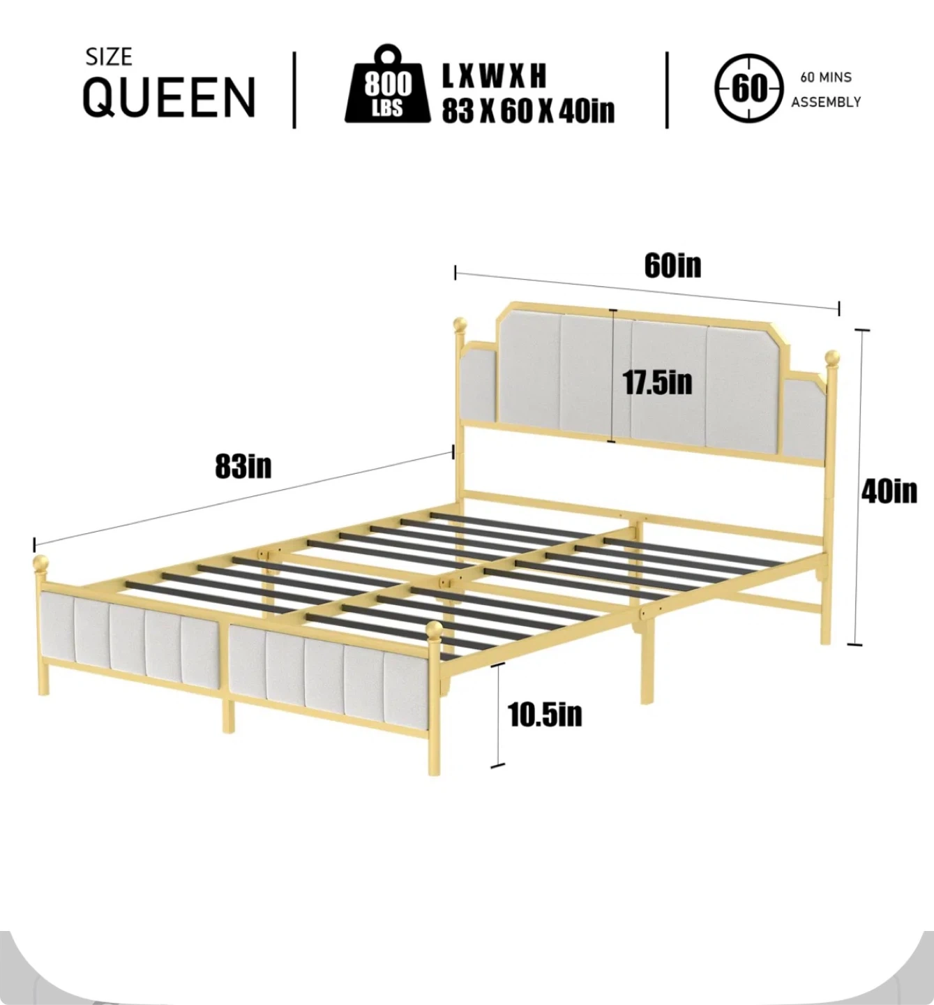Selling a queen size bed frame and queen size mattress,in a stylish gold and cream colour scheme. The dimensions are 83 inches in length, 60 inches in width, and 40 inches in height. It also features a screwless structure, making it ideal for small rooms!
